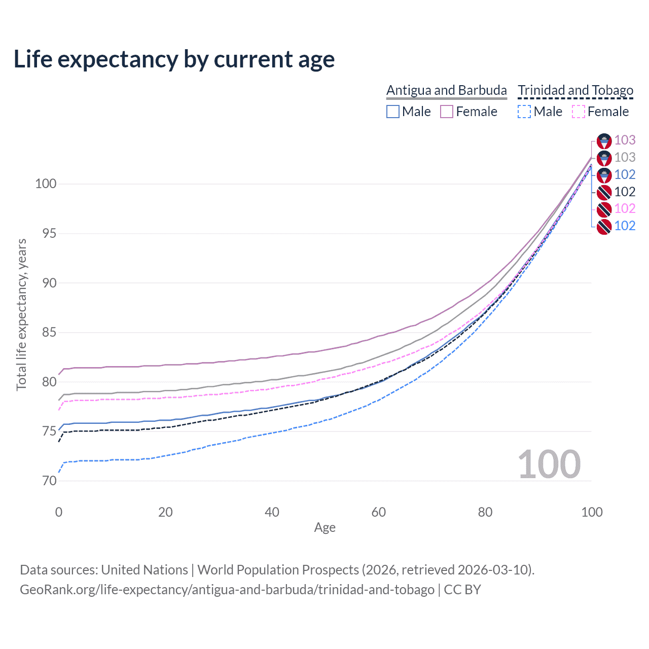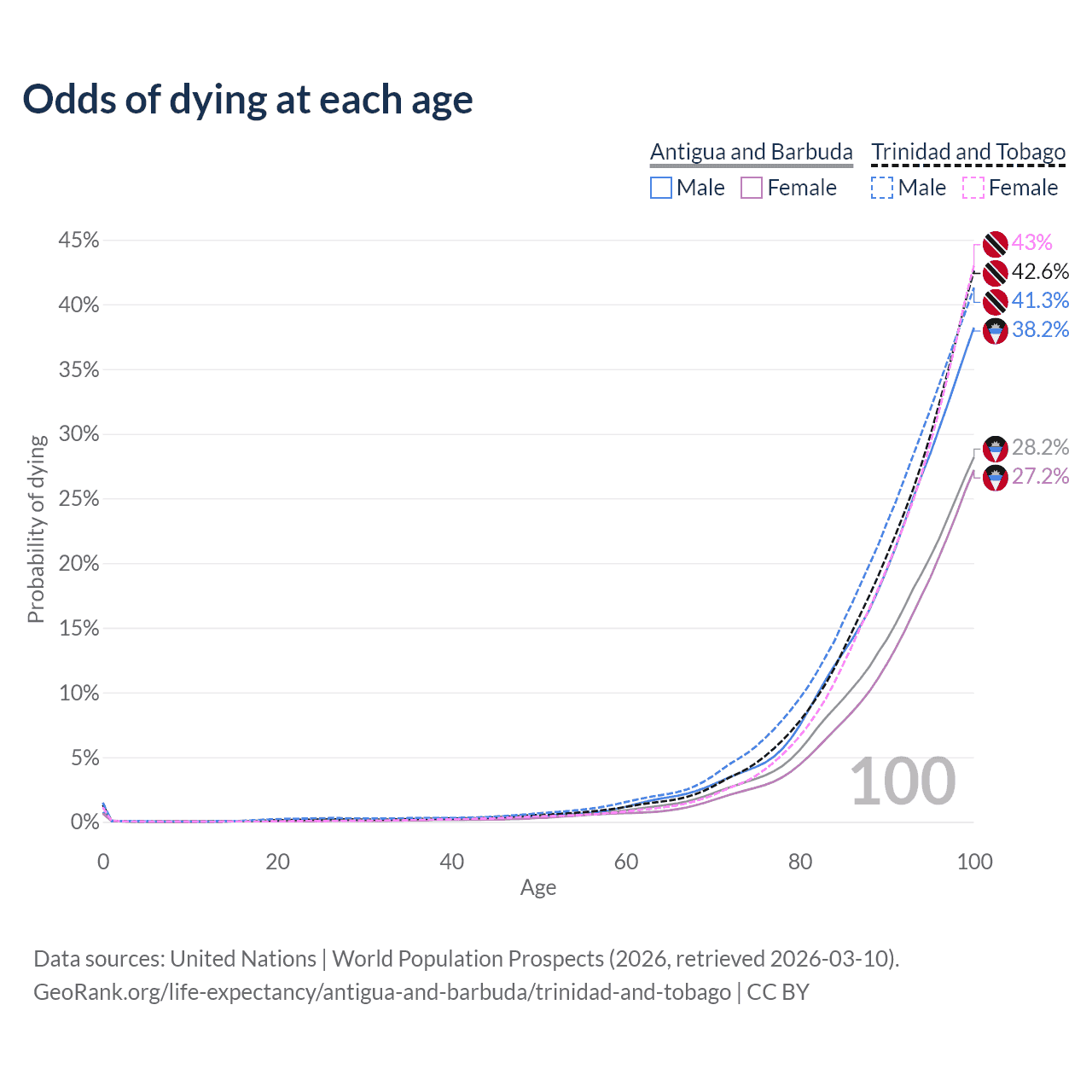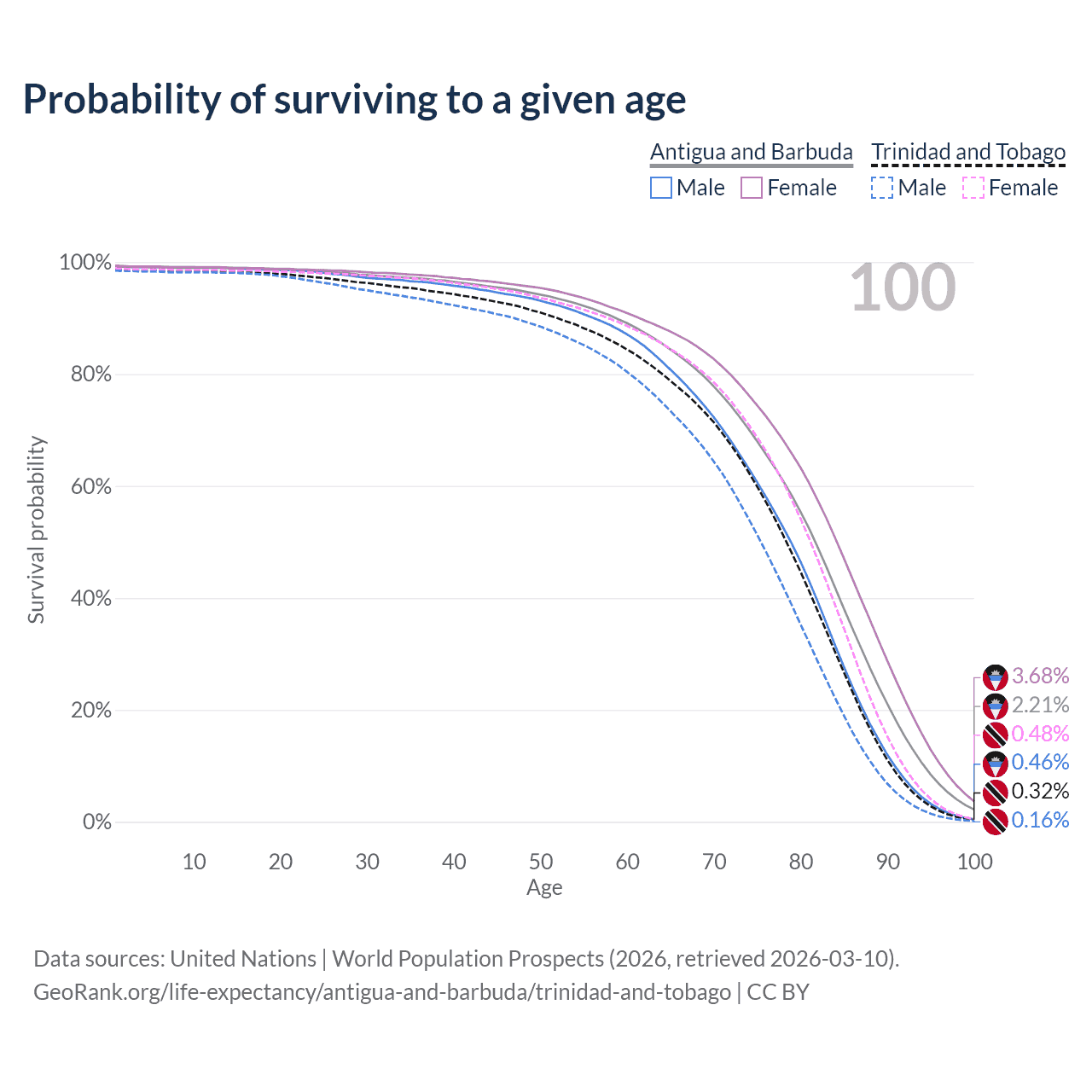 This life expectancy calculator shows the odds of living to 100, 95, 90, and below based on current age for both males and females in Antigua and Barbuda and Trinidad and Tobago, along with mean and median age of death. The calculations are based on the 2026 life tables (actuarial tables) from the UN World Population Prospects.