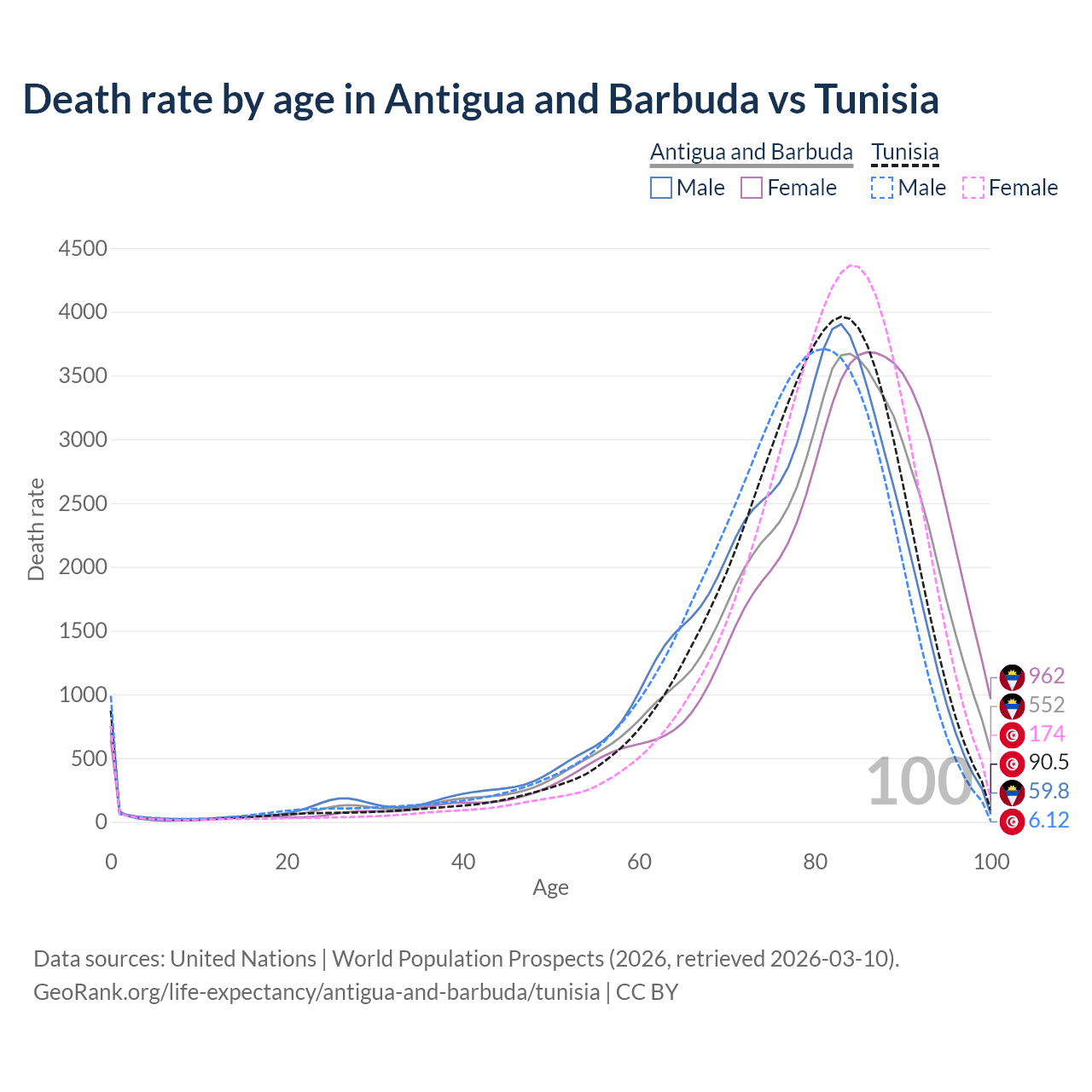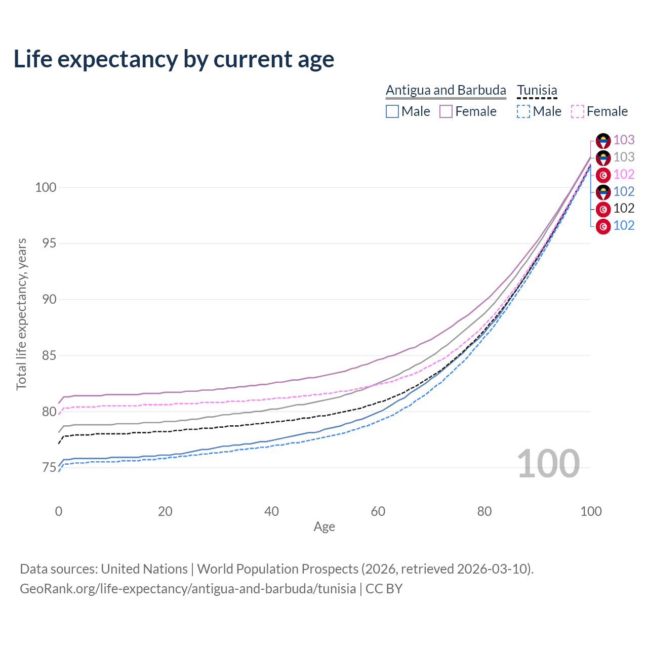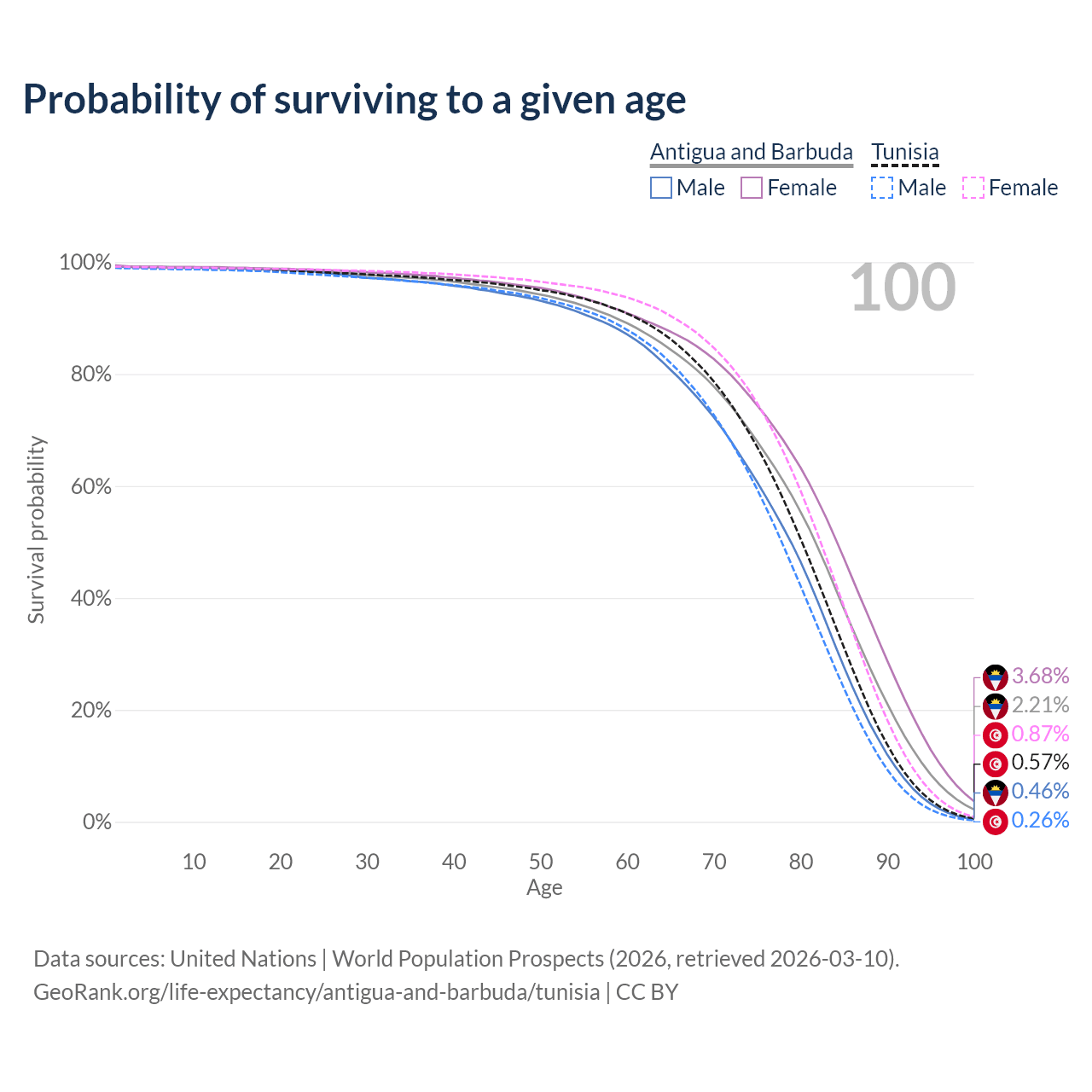 This life expectancy calculator shows the odds of living to 100, 95, 90, and below based on current age for both males and females in Antigua and Barbuda and Tunisia, along with mean and median age of death. The calculations are based on the 2026 life tables (actuarial tables) from the UN World Population Prospects.