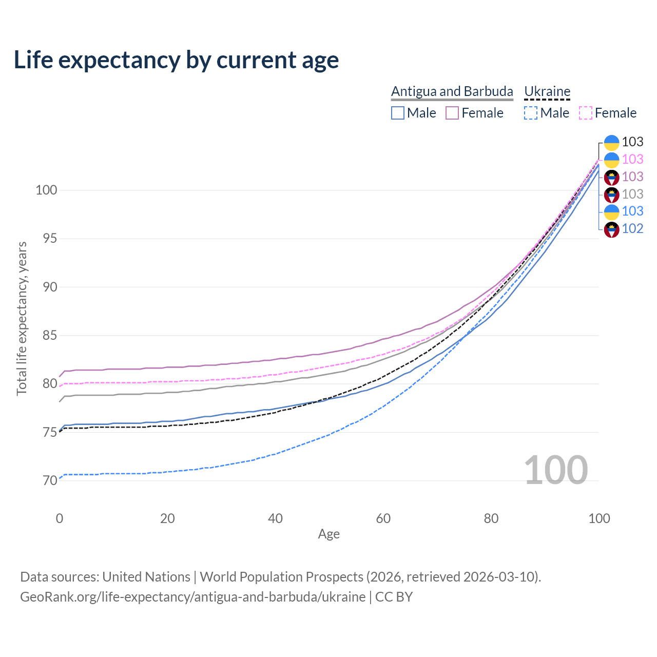 This life expectancy calculator shows the odds of living to 100, 95, 90, and below based on current age for both males and females in Antigua and Barbuda and Ukraine, along with mean and median age of death. The calculations are based on the 2026 life tables (actuarial tables) from the UN World Population Prospects.