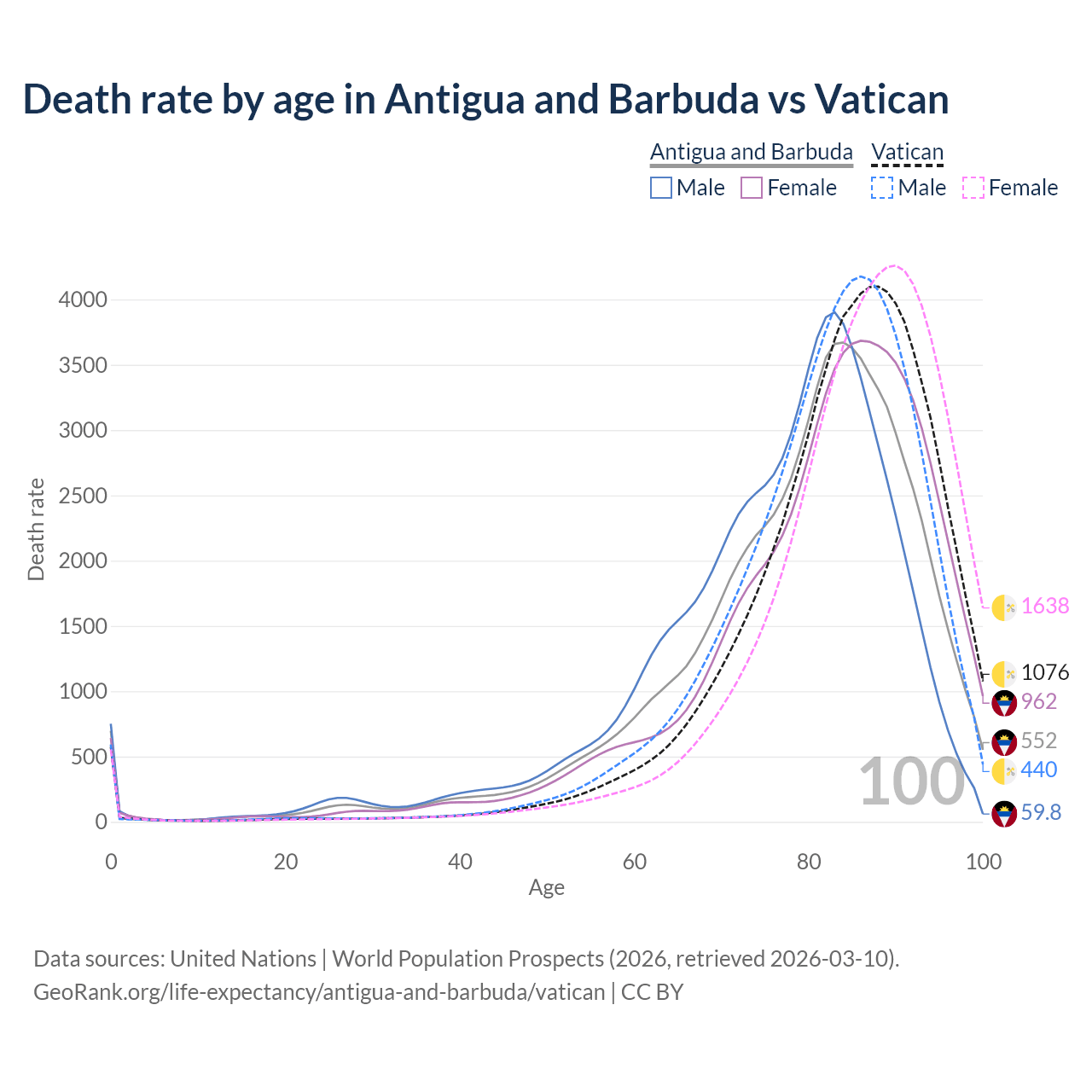 In Antigua and Barbuda, the most common age of death is 84, compared to 88 in the Vatican. The median age of death is 81.7 in Antigua and Barbuda and 85.7 in the Vatican, meaning only half of each cohort is expected to live past that age.