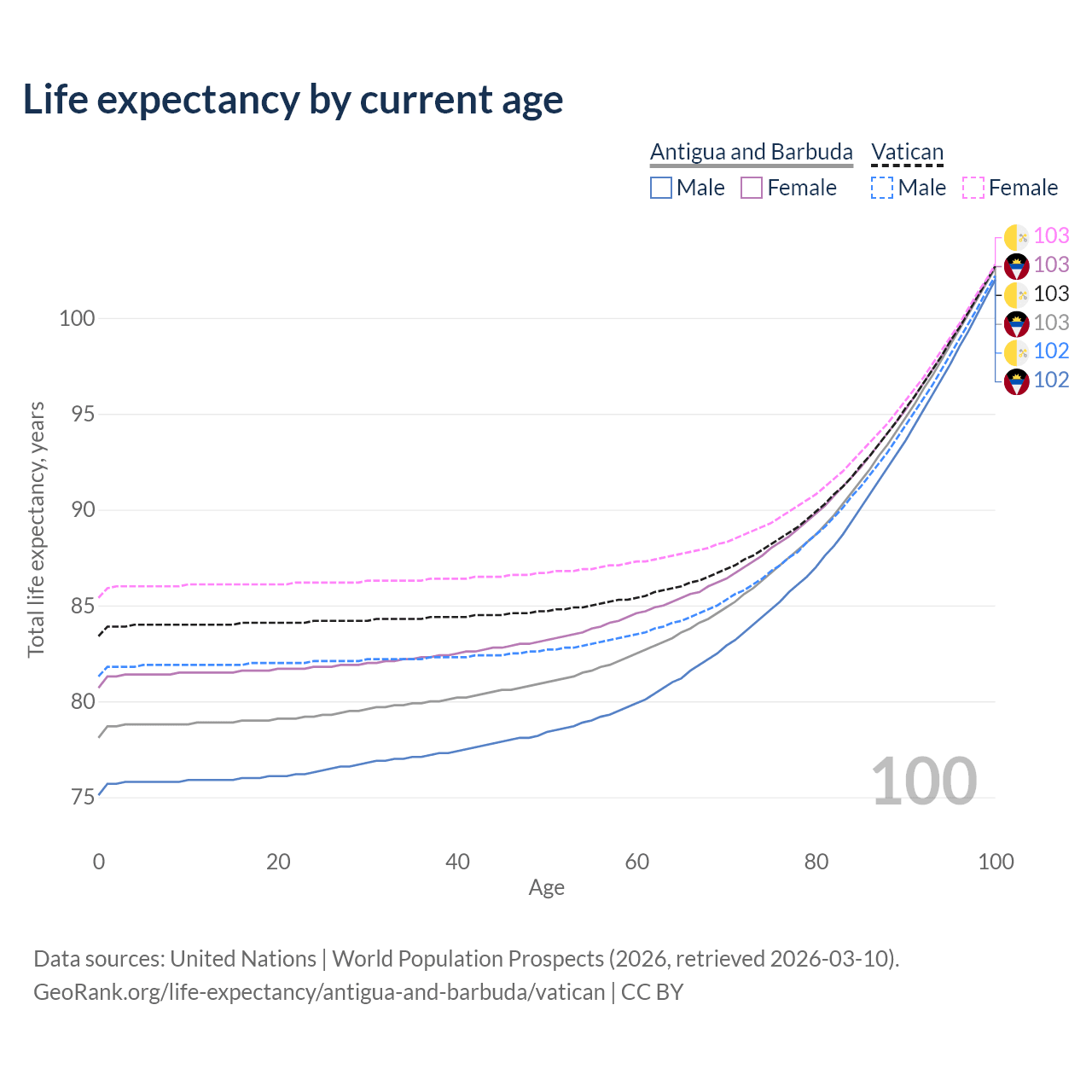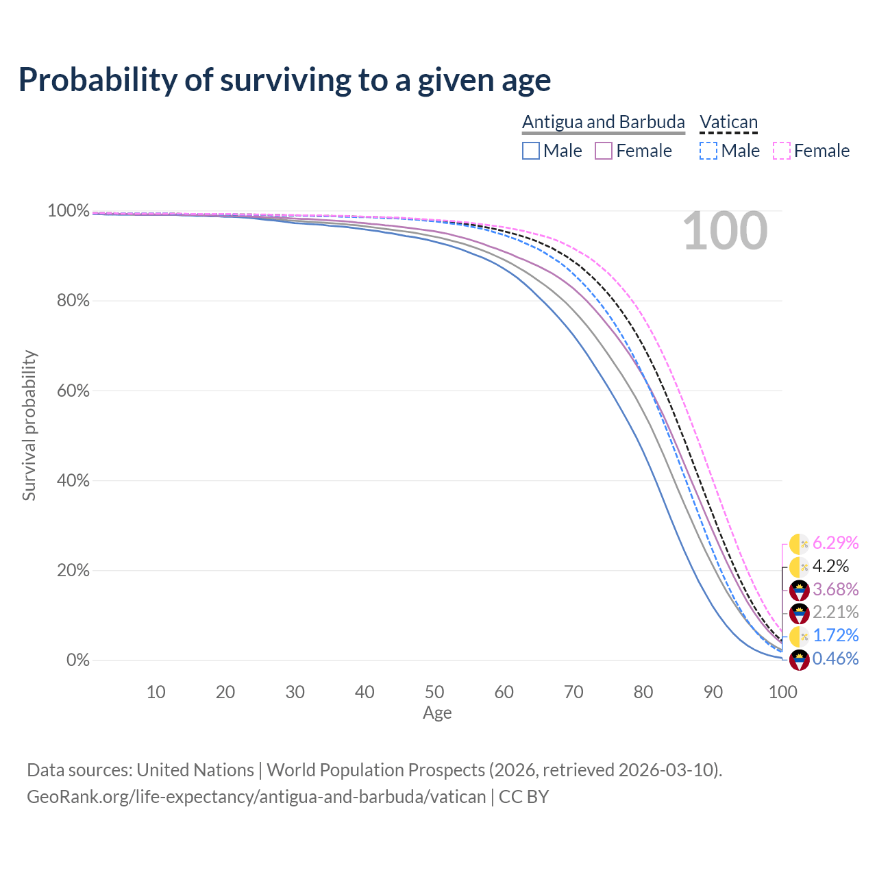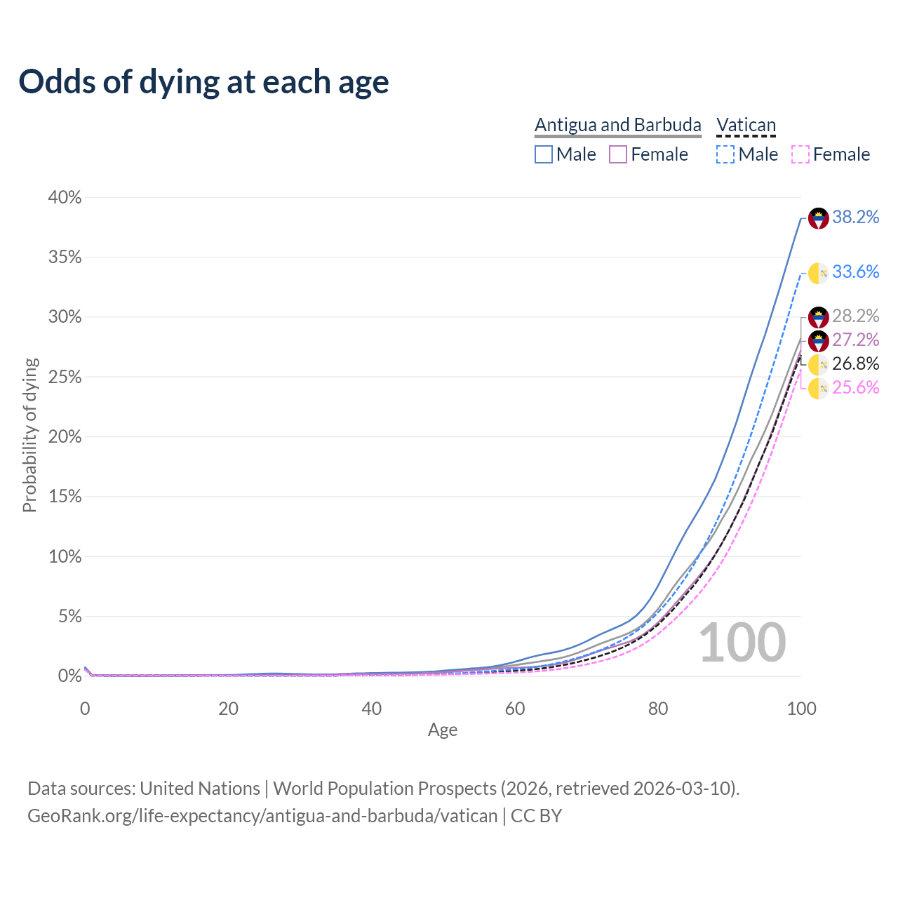 This life expectancy calculator shows the odds of living to 100, 95, 90, and below based on current age for both males and females in Antigua and Barbuda and the Vatican, along with mean and median age of death. The calculations are based on the 2026 life tables (actuarial tables) from the UN World Population Prospects.