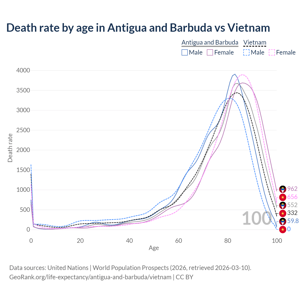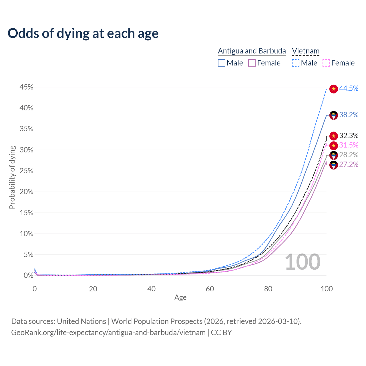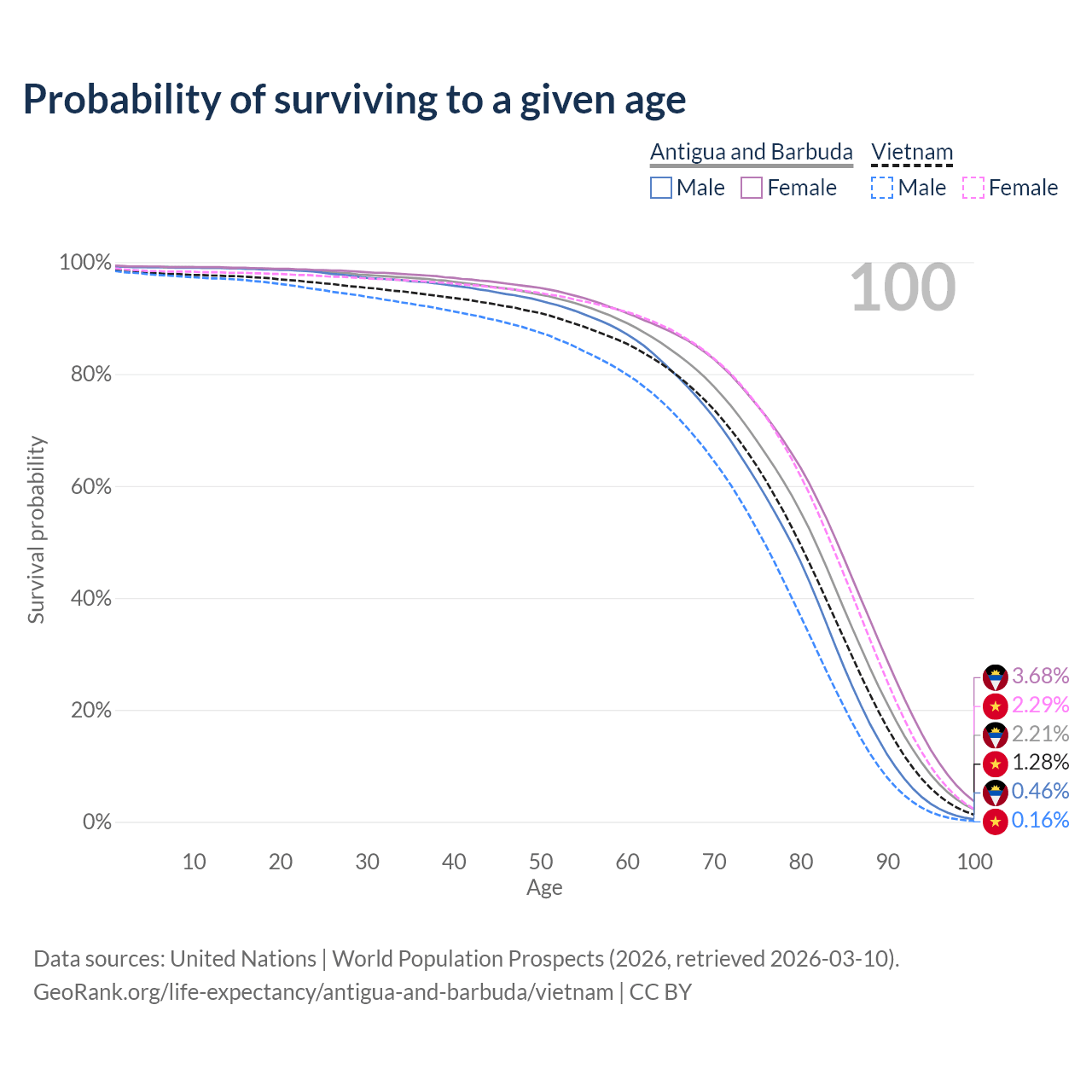 This life expectancy calculator shows the odds of living to 100, 95, 90, and below based on current age for both males and females in Antigua and Barbuda and Vietnam, along with mean and median age of death. The calculations are based on the 2026 life tables (actuarial tables) from the UN World Population Prospects.