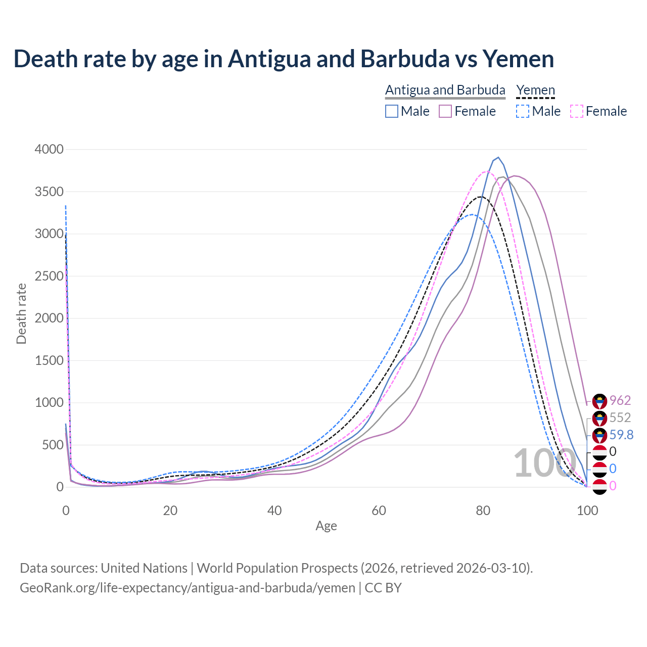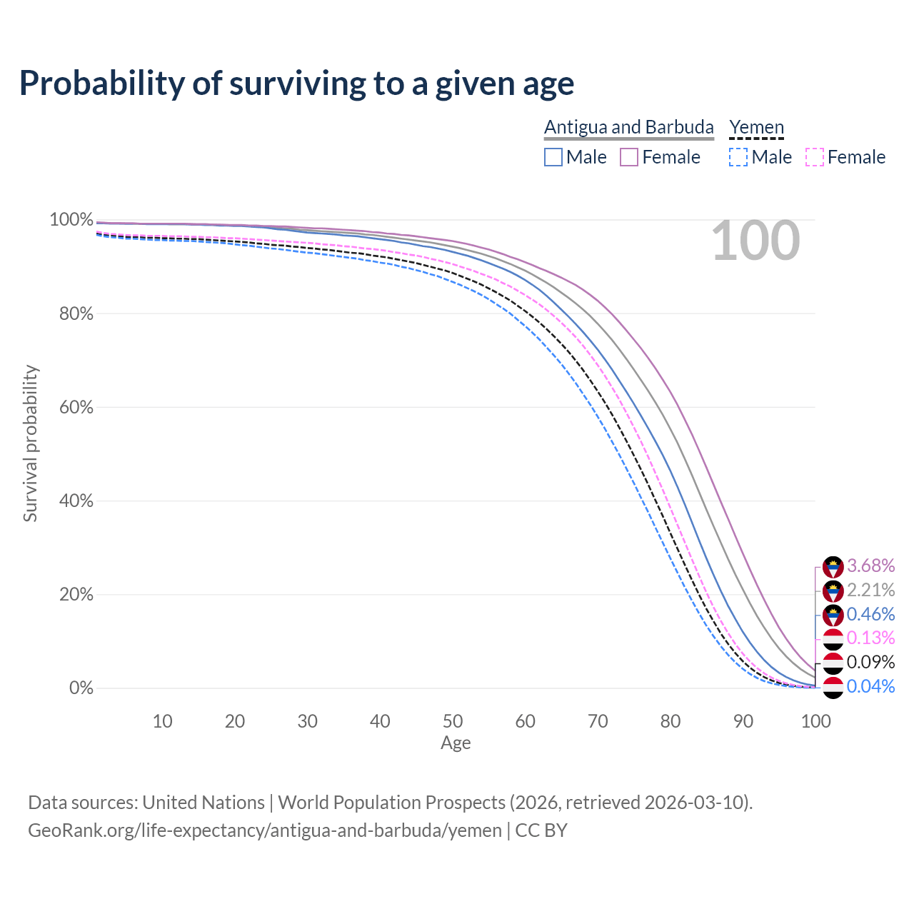 This life expectancy calculator shows the odds of living to 100, 95, 90, and below based on current age for both males and females in Antigua and Barbuda and Yemen, along with mean and median age of death. The calculations are based on the 2026 life tables (actuarial tables) from the UN World Population Prospects.