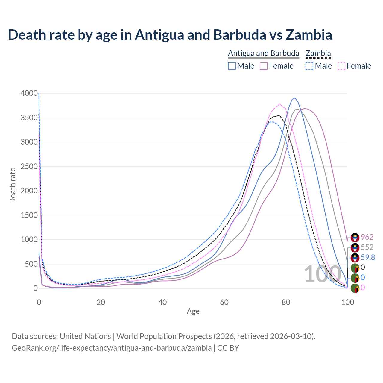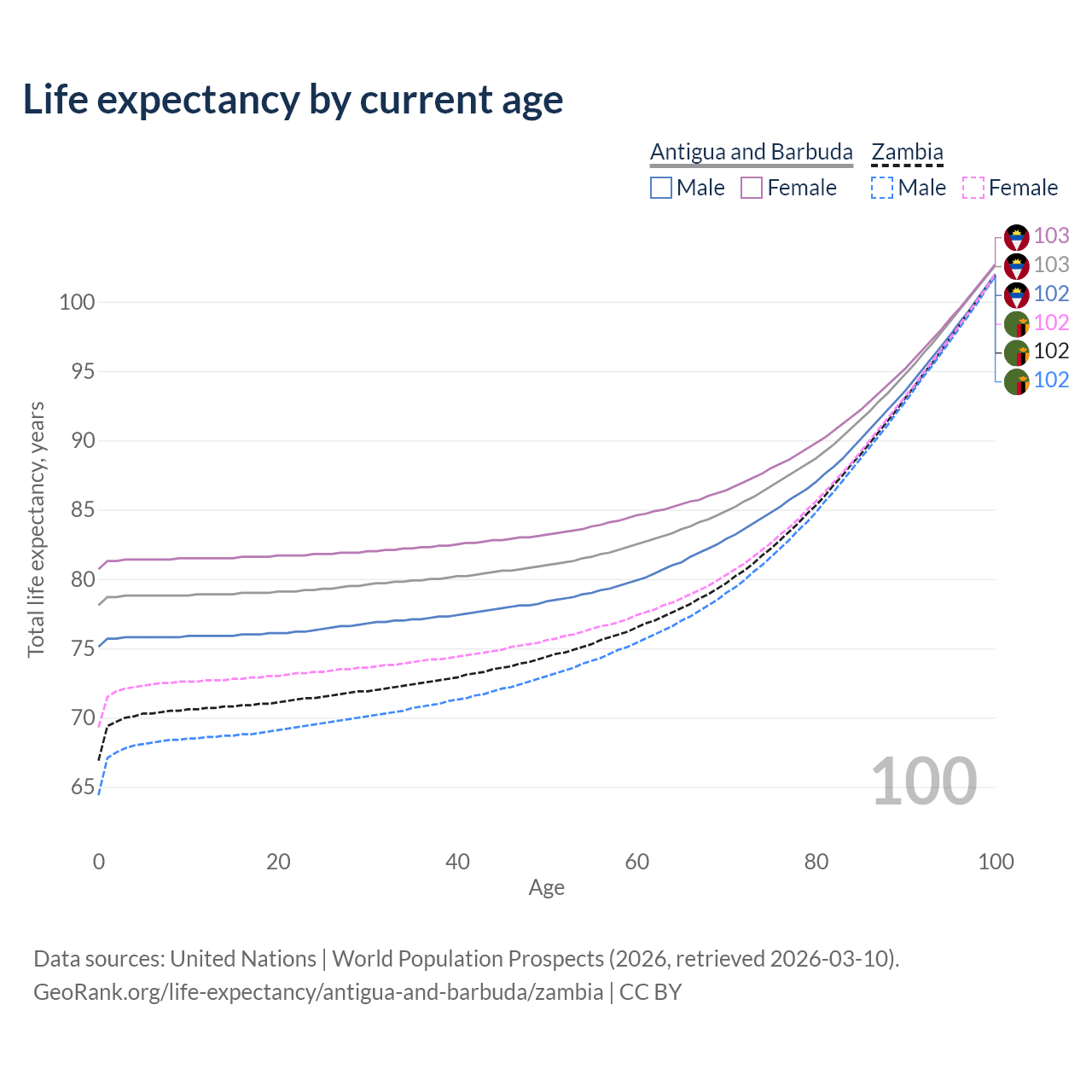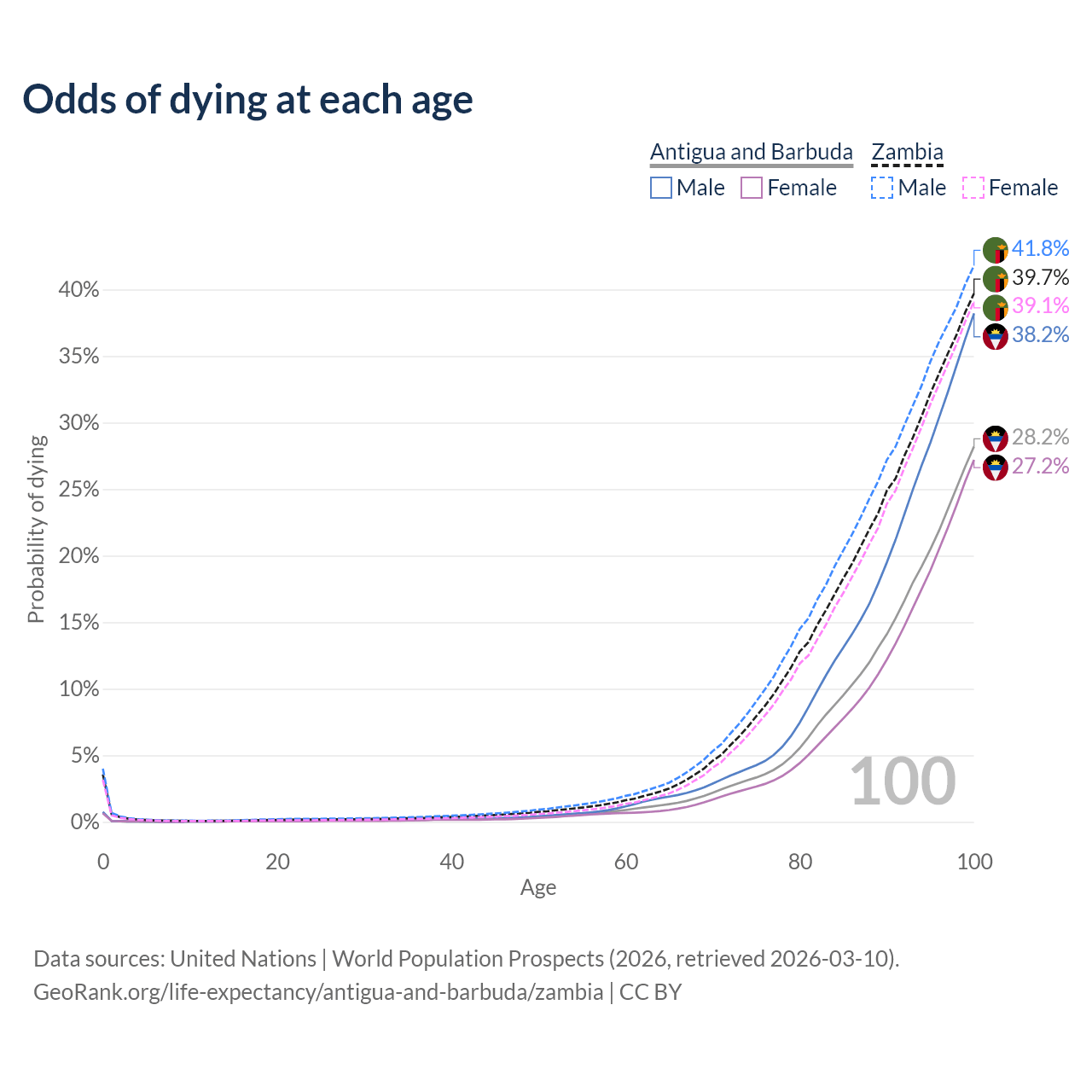 This life expectancy calculator shows the odds of living to 100, 95, 90, and below based on current age for both males and females in Antigua and Barbuda and Zambia, along with mean and median age of death. The calculations are based on the 2026 life tables (actuarial tables) from the UN World Population Prospects.