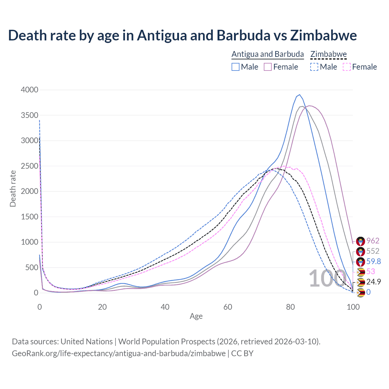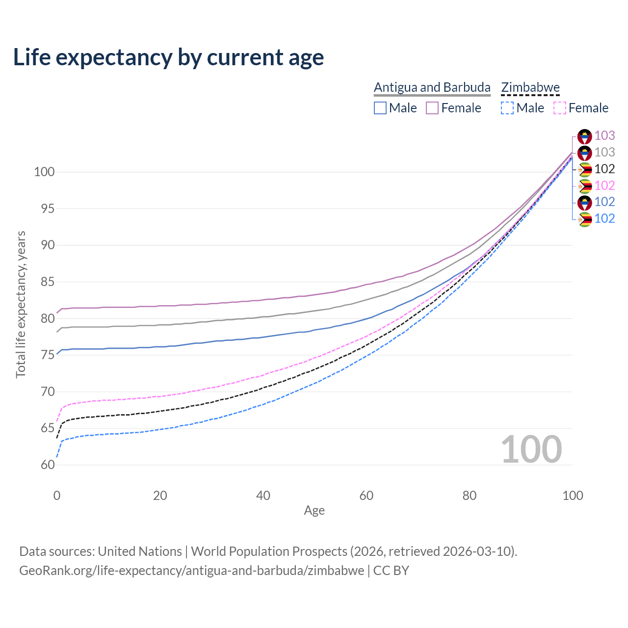 This life expectancy calculator shows the odds of living to 100, 95, 90, and below based on current age for both males and females in Antigua and Barbuda and Zimbabwe, along with mean and median age of death. The calculations are based on the 2026 life tables (actuarial tables) from the UN World Population Prospects.