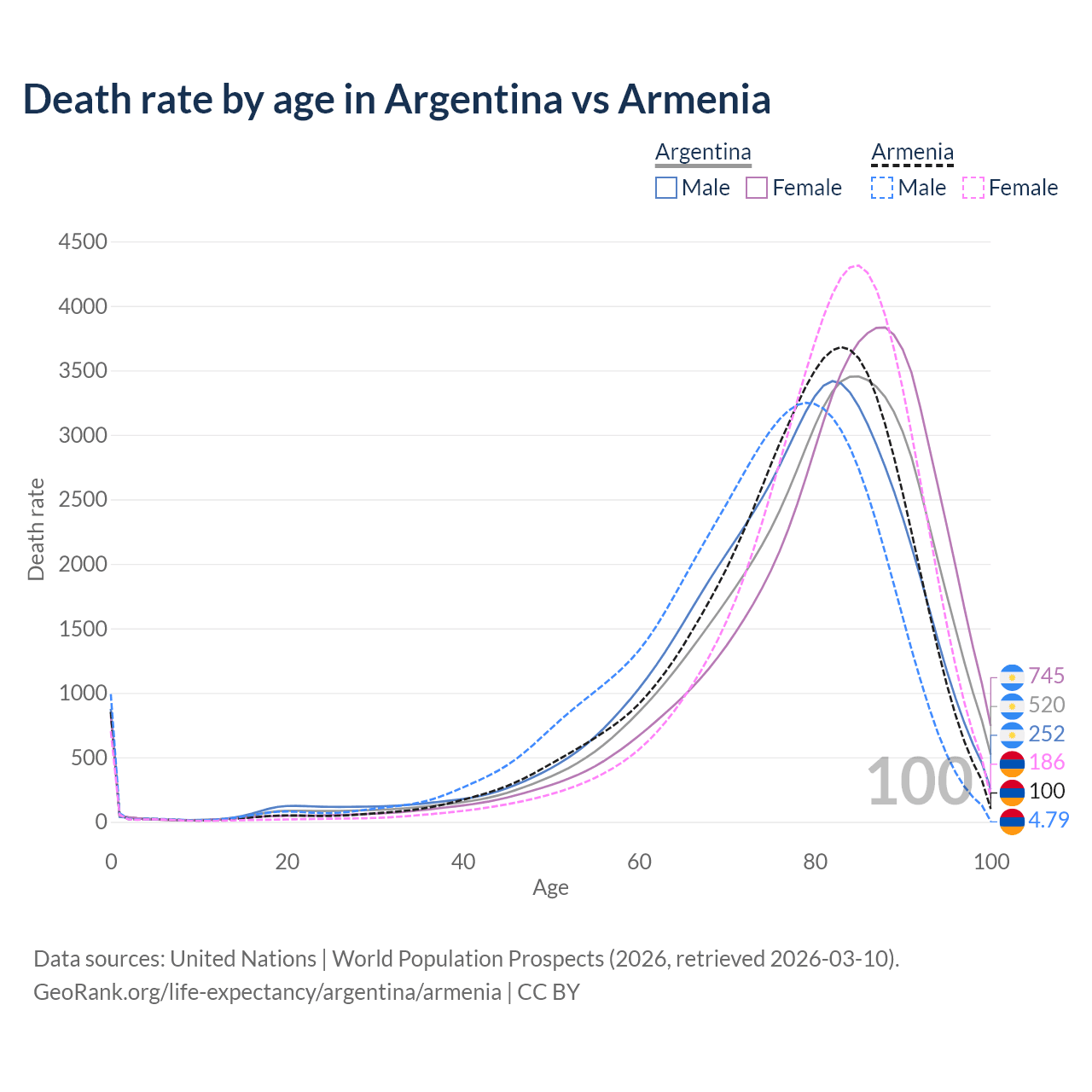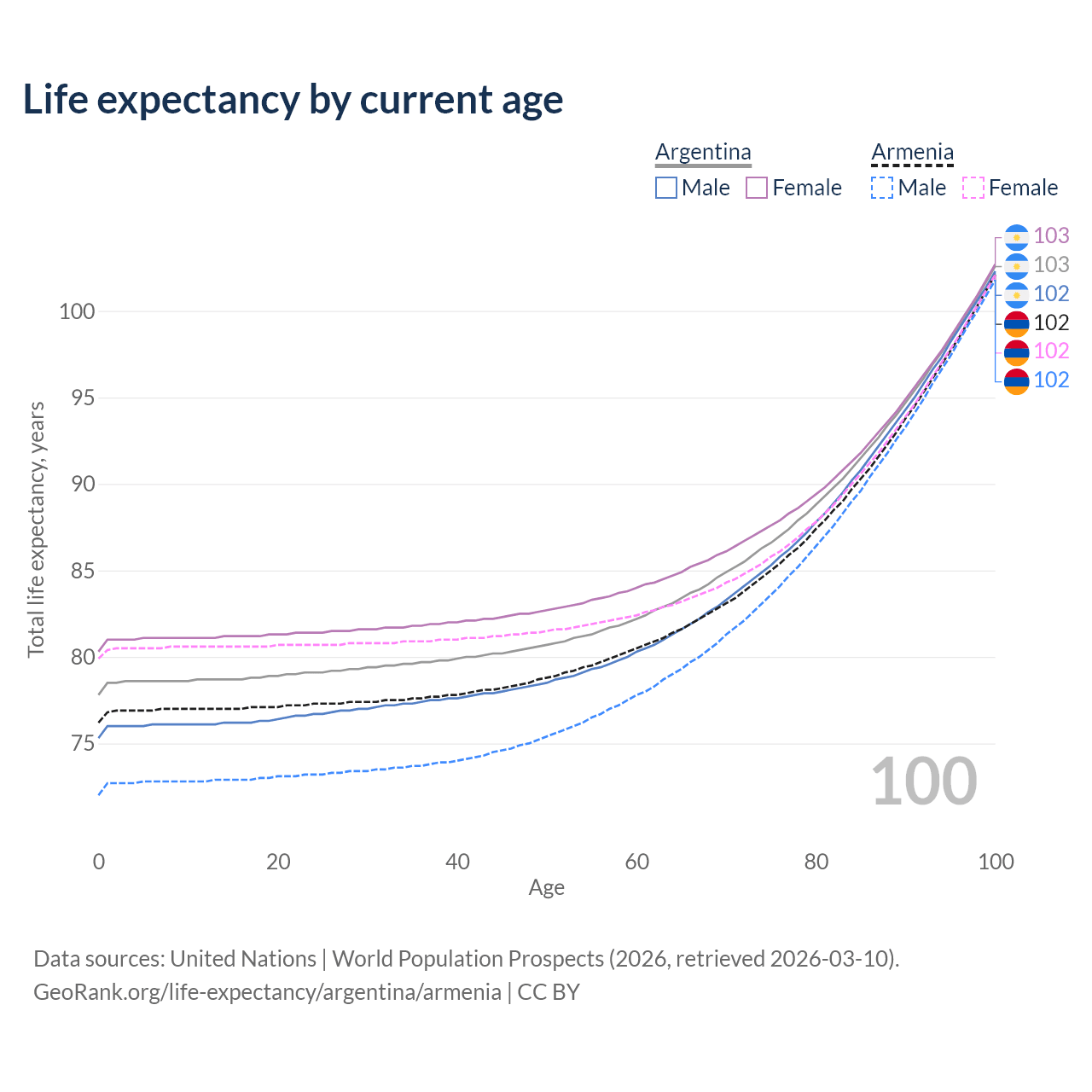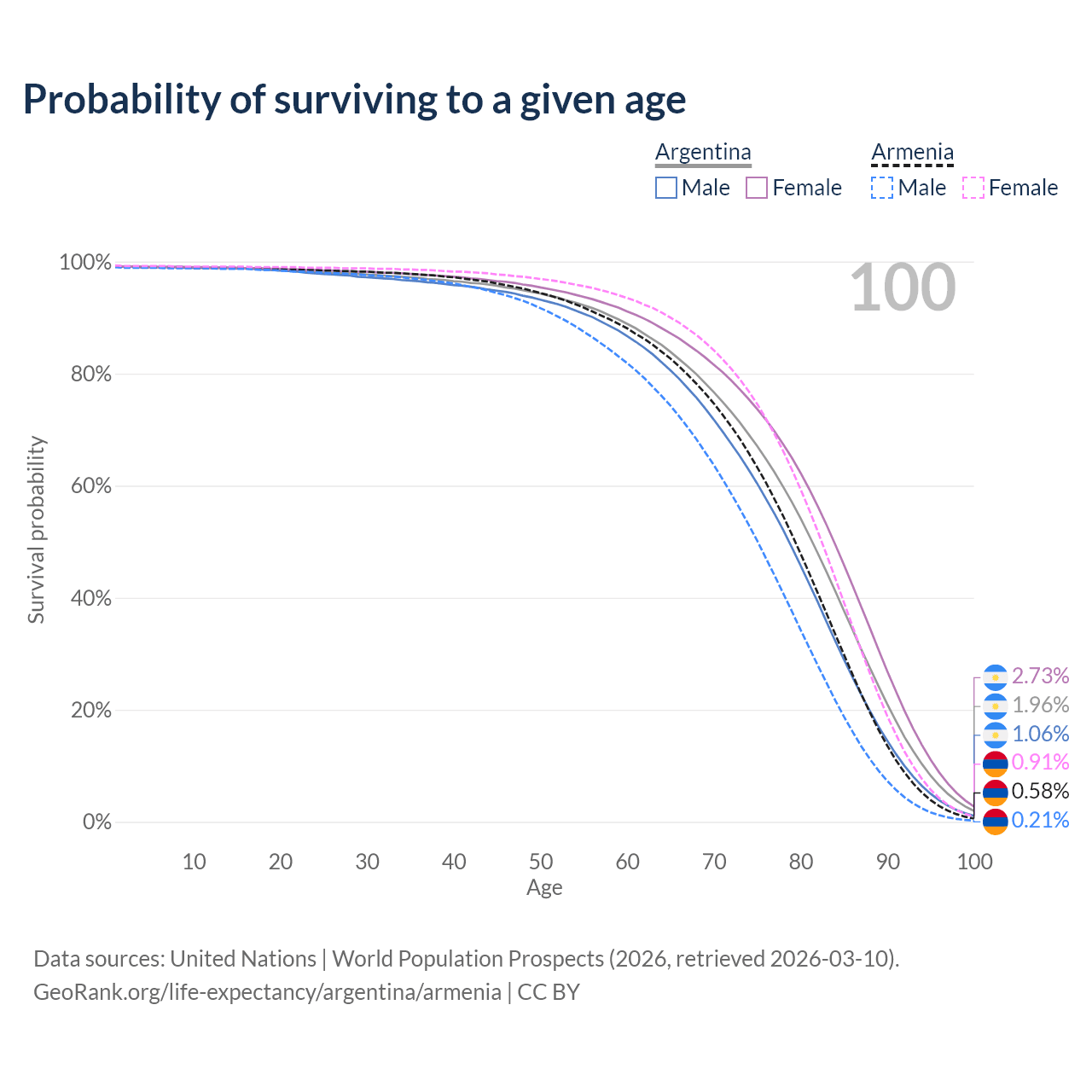This life expectancy calculator shows the odds of living to 100, 95, 90, and below based on current age for both males and females in Argentina and Armenia, along with mean and median age of death. The calculations are based on the 2026 life tables (actuarial tables) from the UN World Population Prospects.