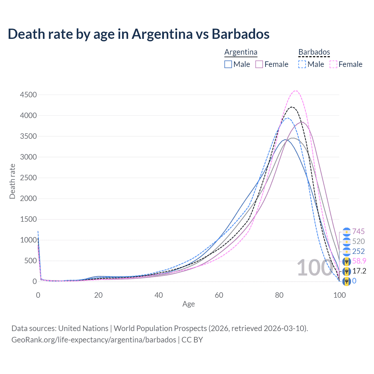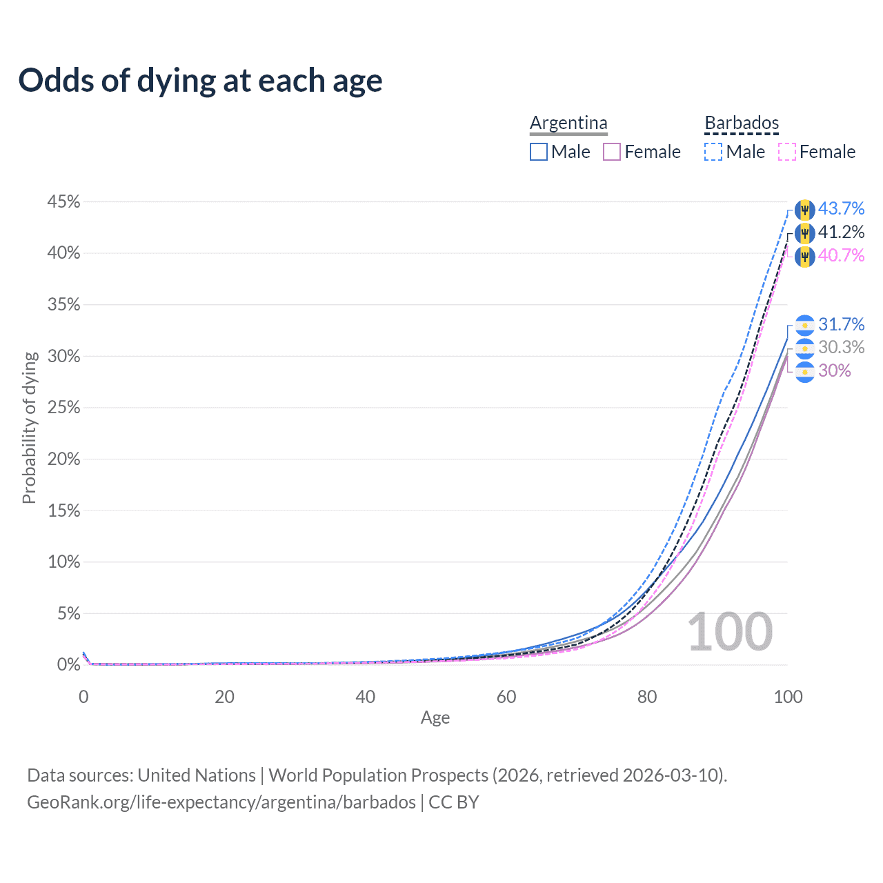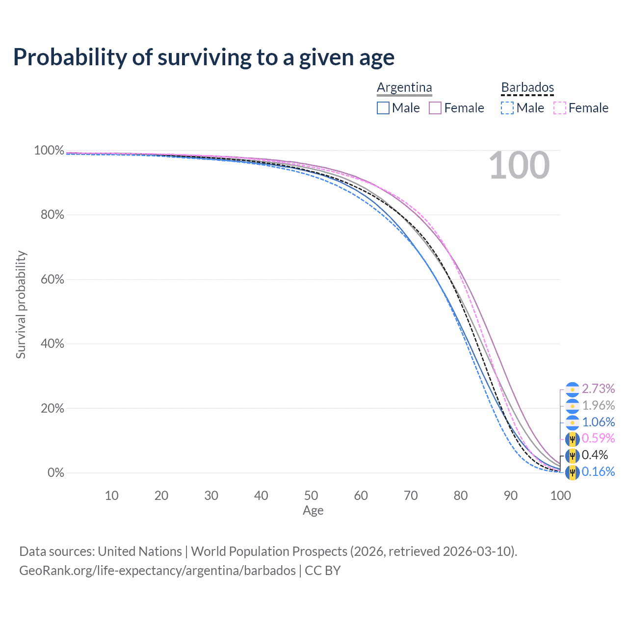 This life expectancy calculator shows the odds of living to 100, 95, 90, and below based on current age for both males and females in Argentina and Barbados, along with mean and median age of death. The calculations are based on the 2026 life tables (actuarial tables) from the UN World Population Prospects.