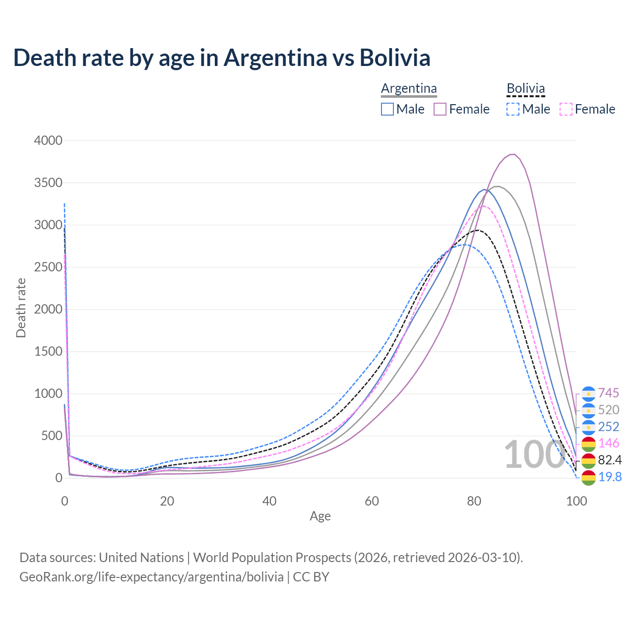 In Argentina, the most common age of death is 85, compared to 0 in Bolivia. The median age of death is 81.4 in Argentina and 74.5 in Bolivia, meaning only half of each cohort is expected to live past that age.
