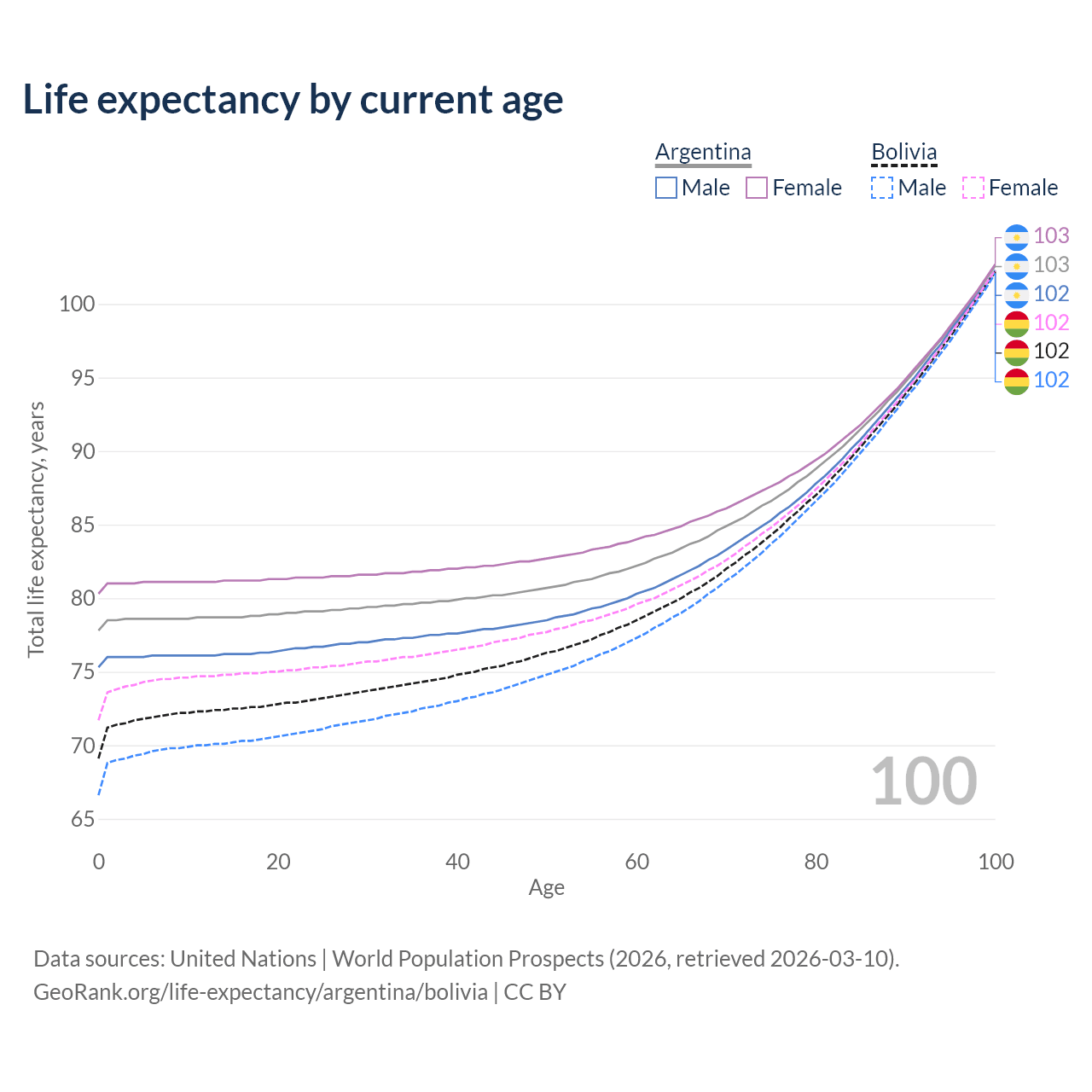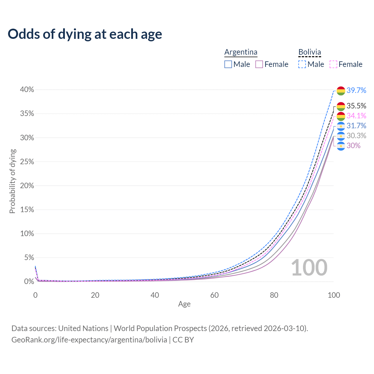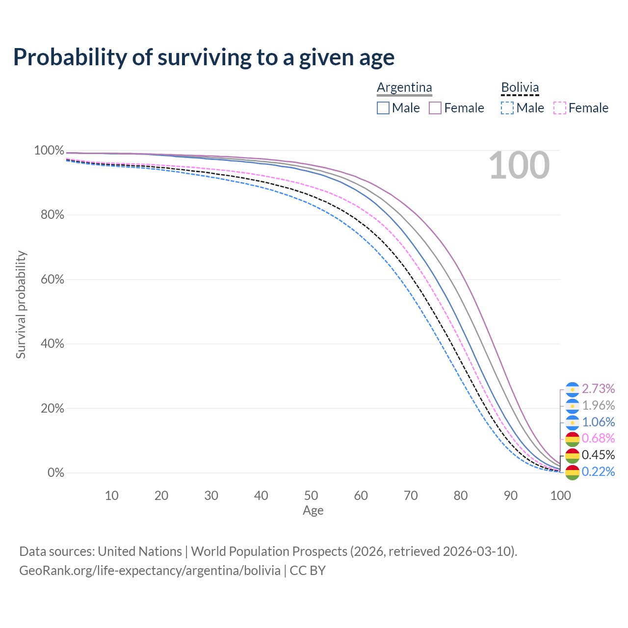 This life expectancy calculator shows the odds of living to 100, 95, 90, and below based on current age for both males and females in Argentina and Bolivia, along with mean and median age of death. The calculations are based on the 2026 life tables (actuarial tables) from the UN World Population Prospects.