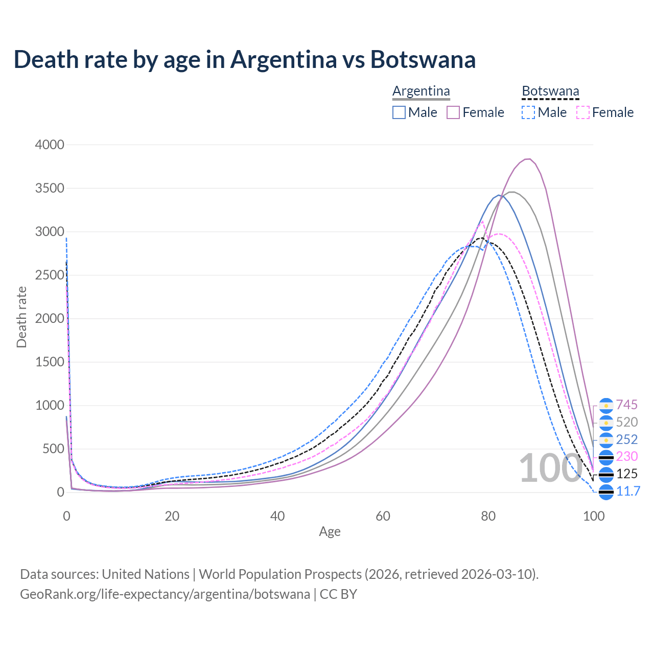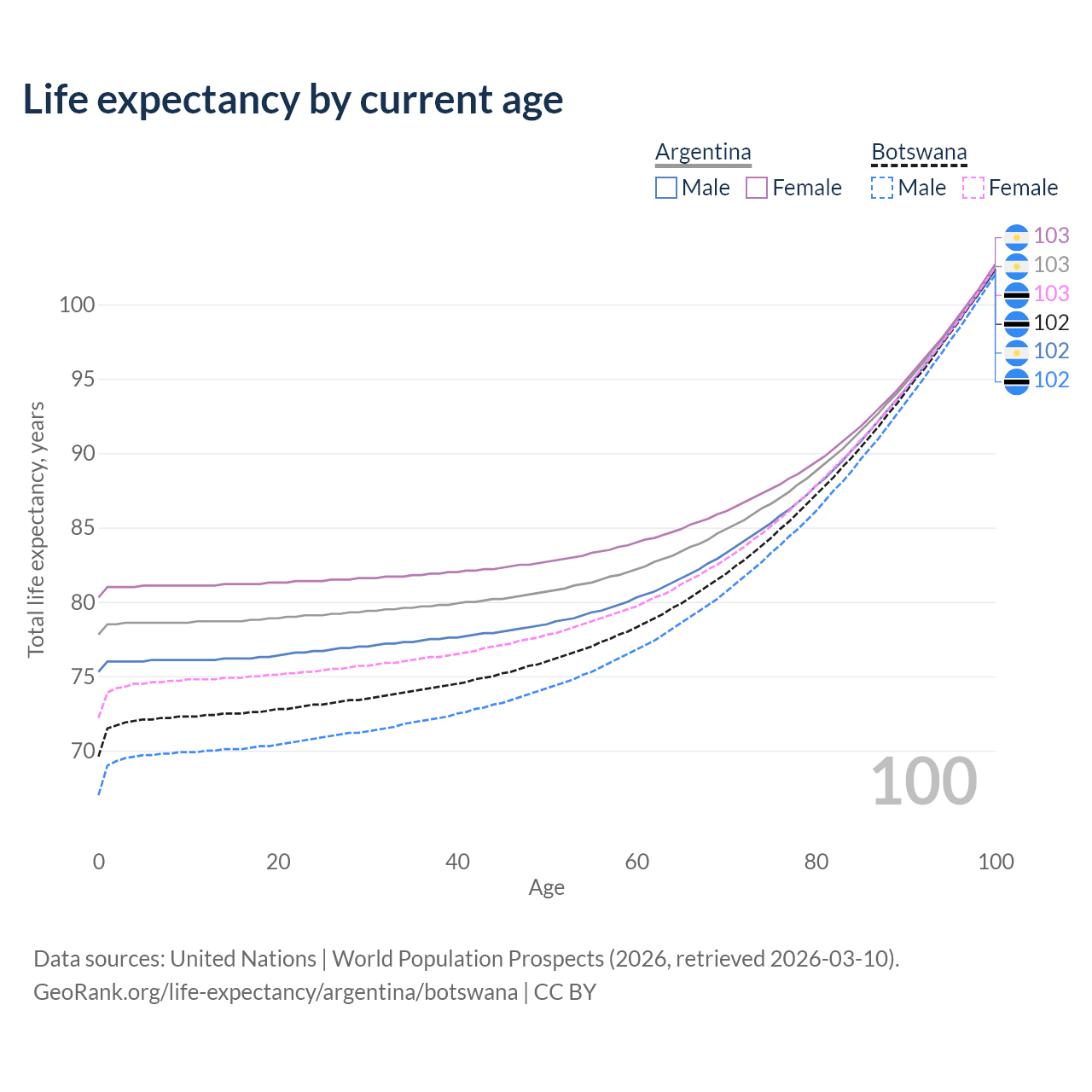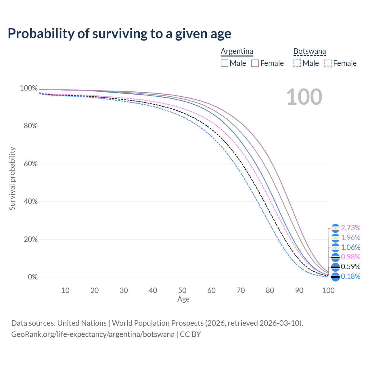 This life expectancy calculator shows the odds of living to 100, 95, 90, and below based on current age for both males and females in Argentina and Botswana, along with mean and median age of death. The calculations are based on the 2026 life tables (actuarial tables) from the UN World Population Prospects.