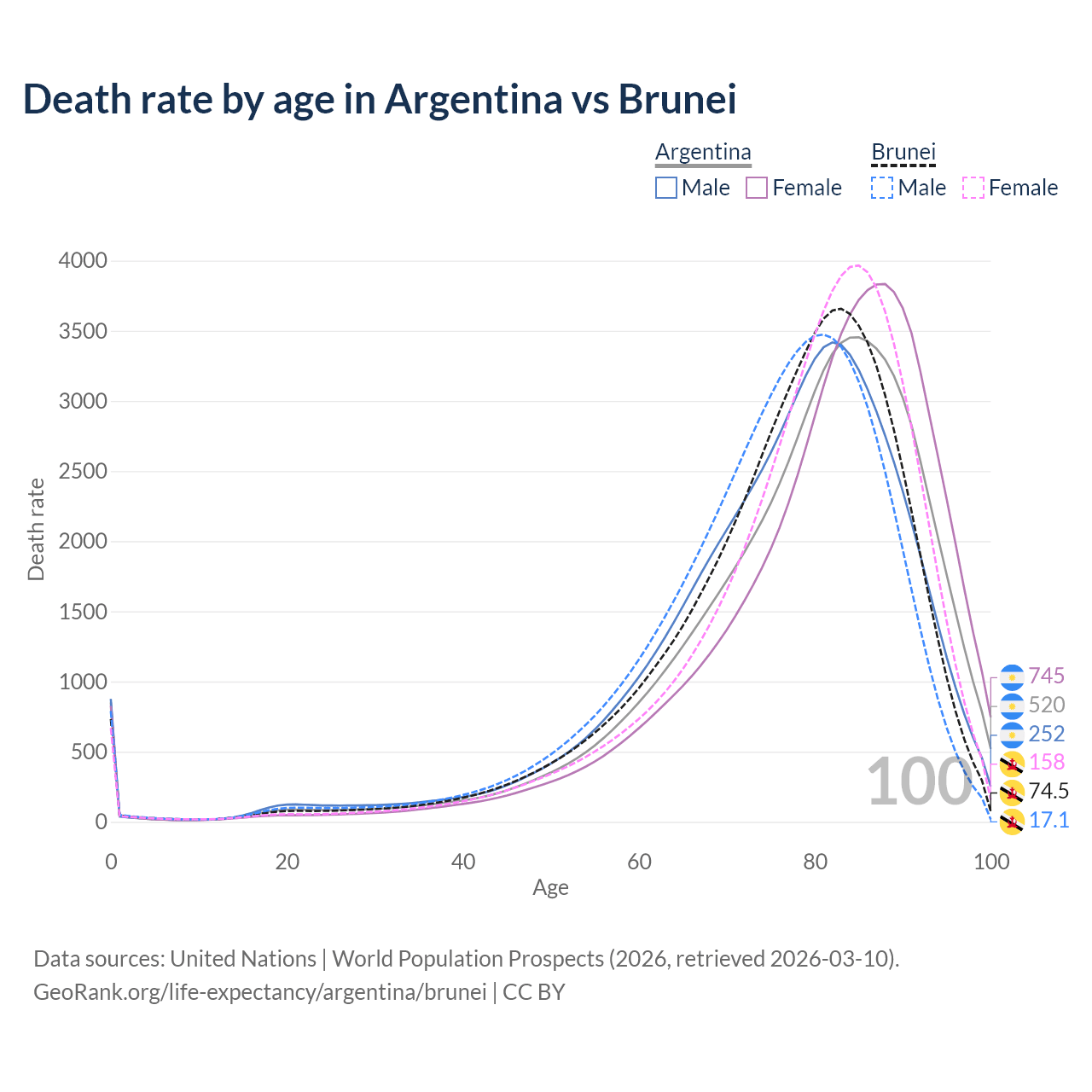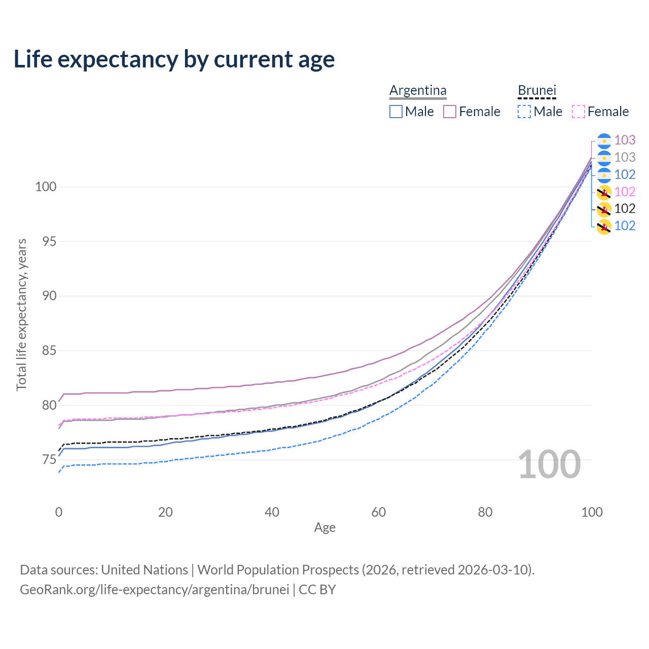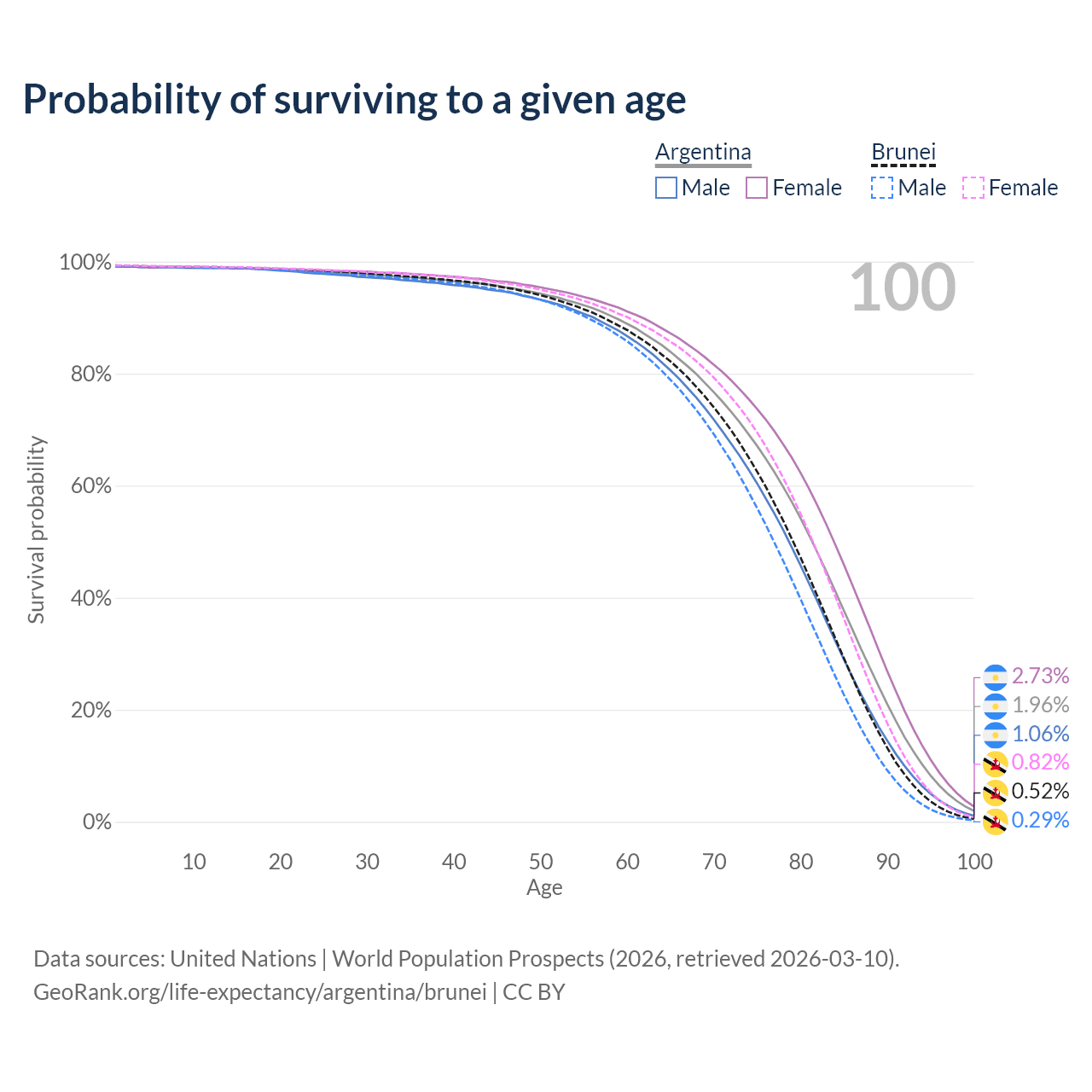 This life expectancy calculator shows the odds of living to 100, 95, 90, and below based on current age for both males and females in Argentina and Brunei, along with mean and median age of death. The calculations are based on the 2026 life tables (actuarial tables) from the UN World Population Prospects.