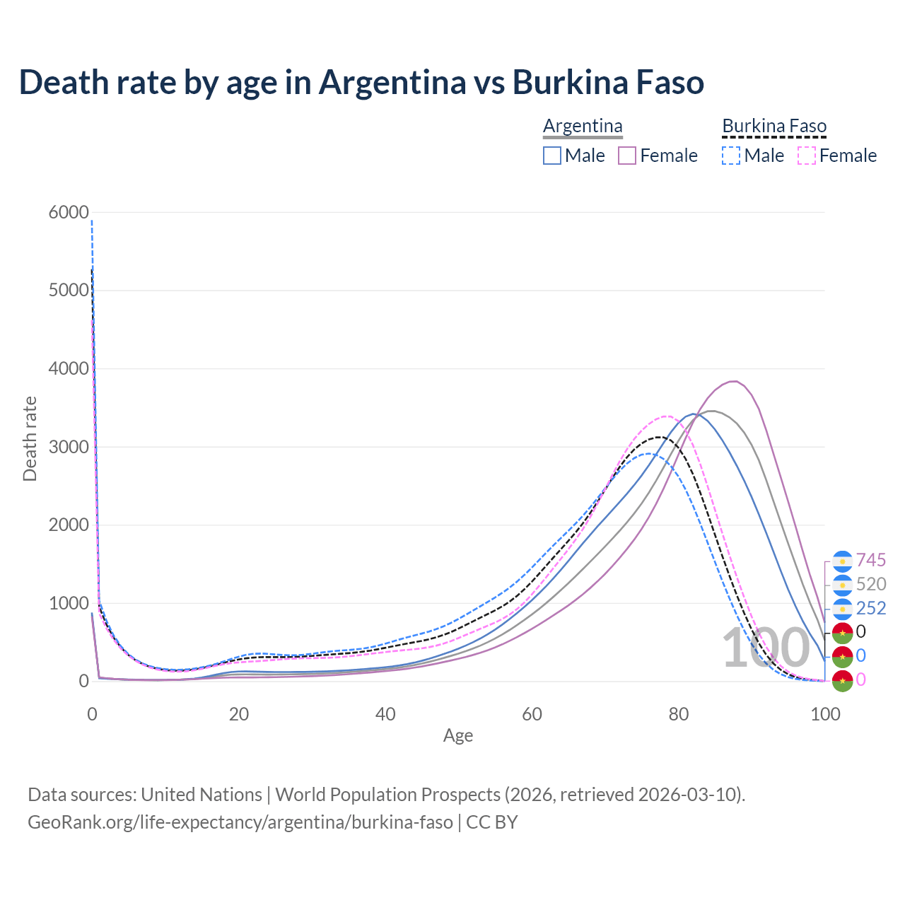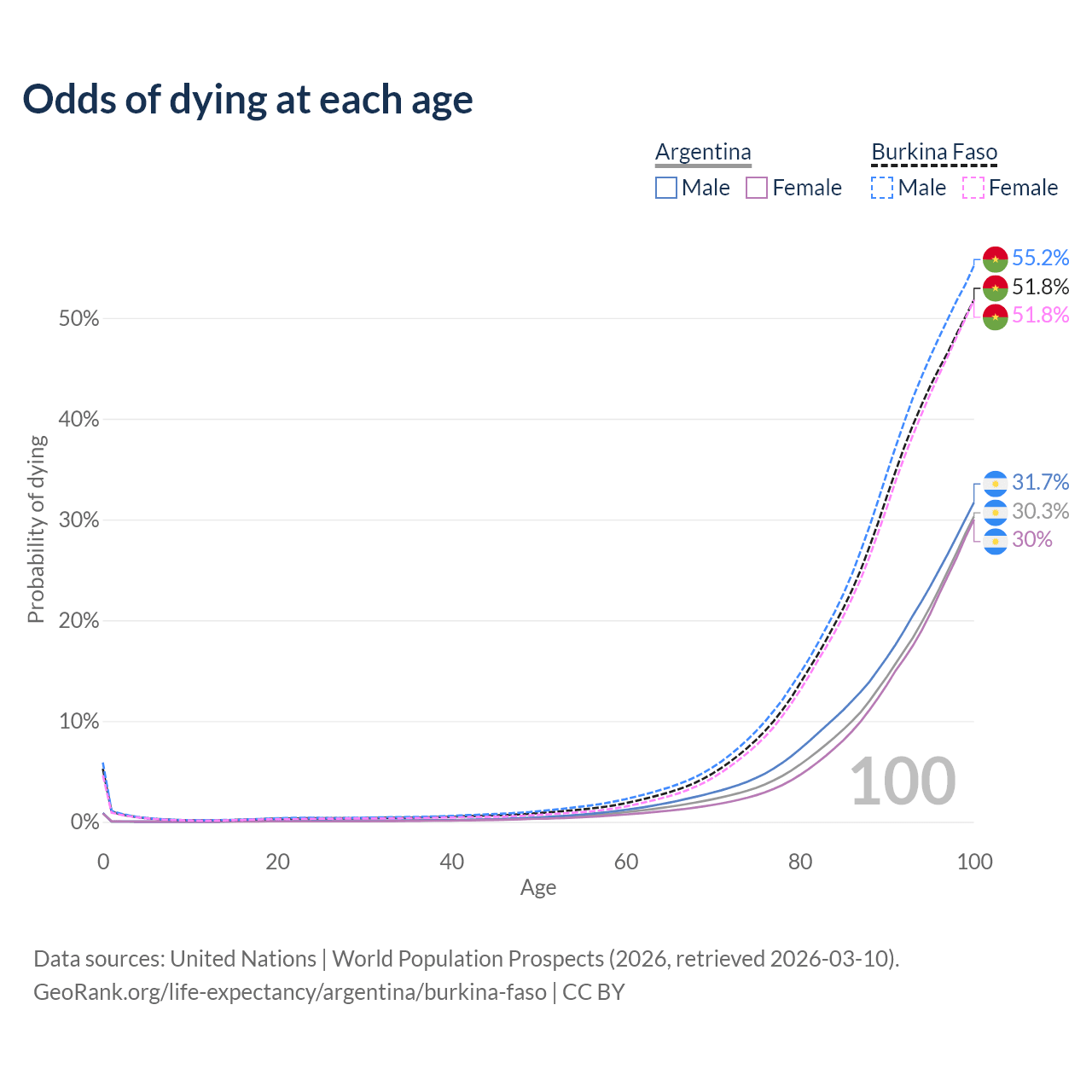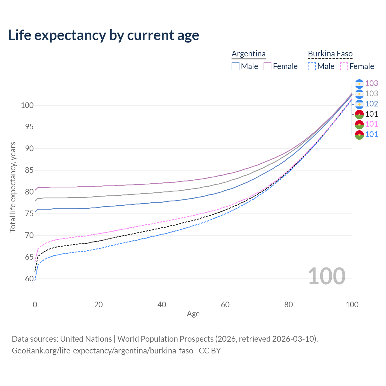 This life expectancy calculator shows the odds of living to 100, 95, 90, and below based on current age for both males and females in Argentina and Burkina Faso, along with mean and median age of death. The calculations are based on the 2026 life tables (actuarial tables) from the UN World Population Prospects.