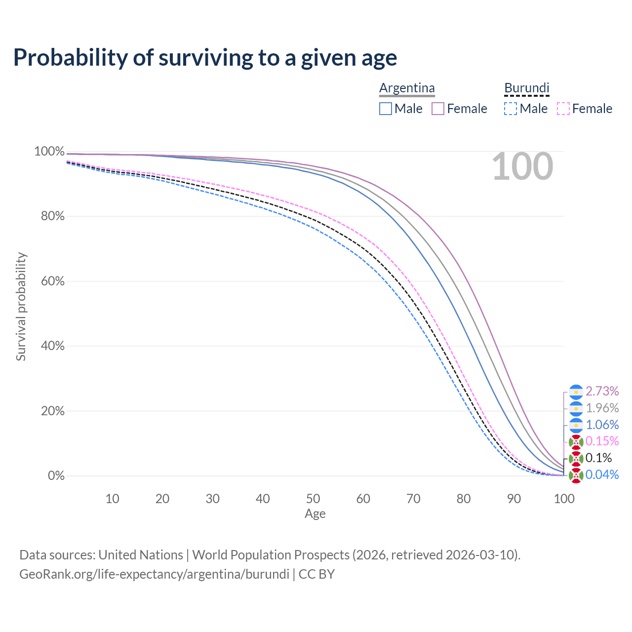 This life expectancy calculator shows the odds of living to 100, 95, 90, and below based on current age for both males and females in Argentina and Burundi, along with mean and median age of death. The calculations are based on the 2026 life tables (actuarial tables) from the UN World Population Prospects.