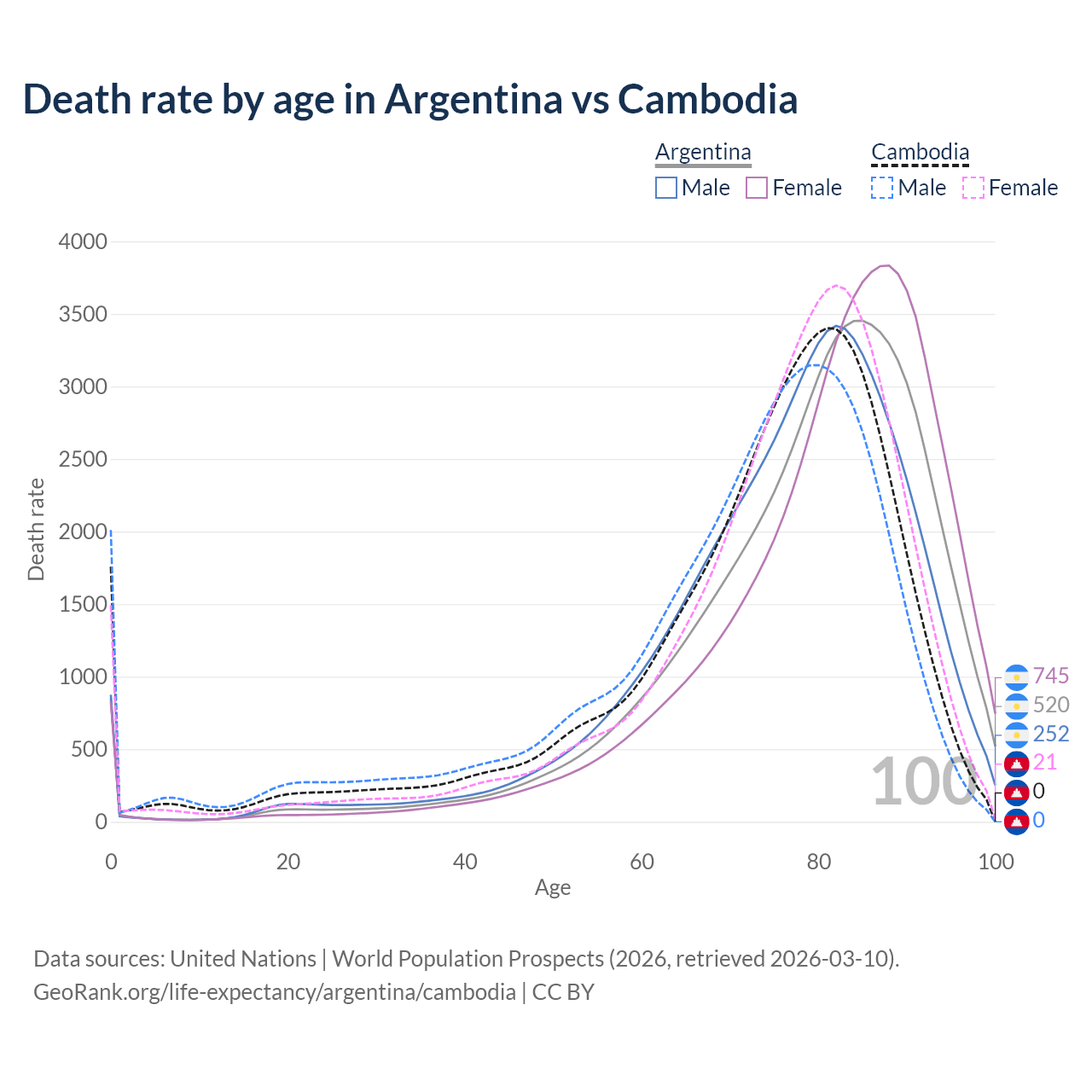 In Argentina, the most common age of death is 85, compared to 81 in Cambodia. The median age of death is 81.4 in Argentina and 76.5 in Cambodia, meaning only half of each cohort is expected to live past that age.