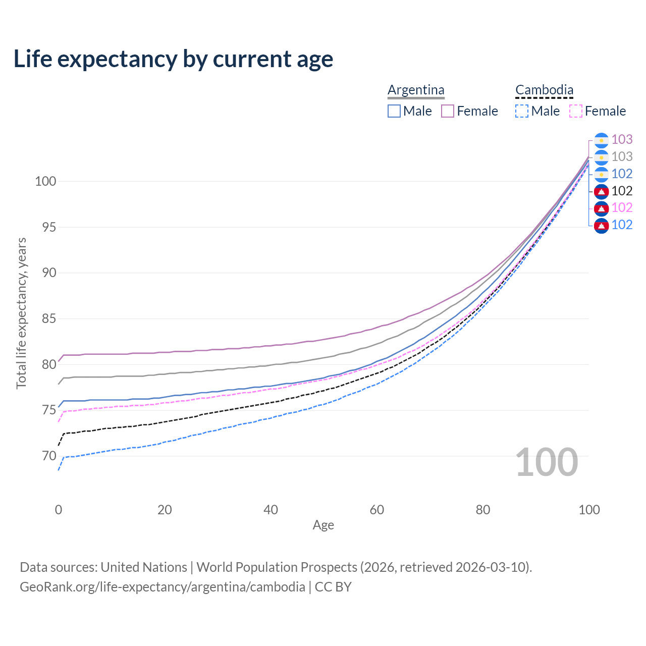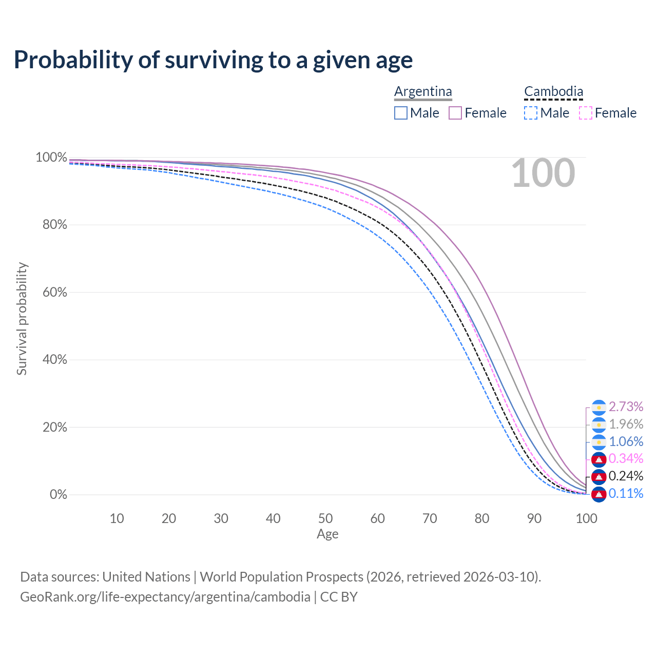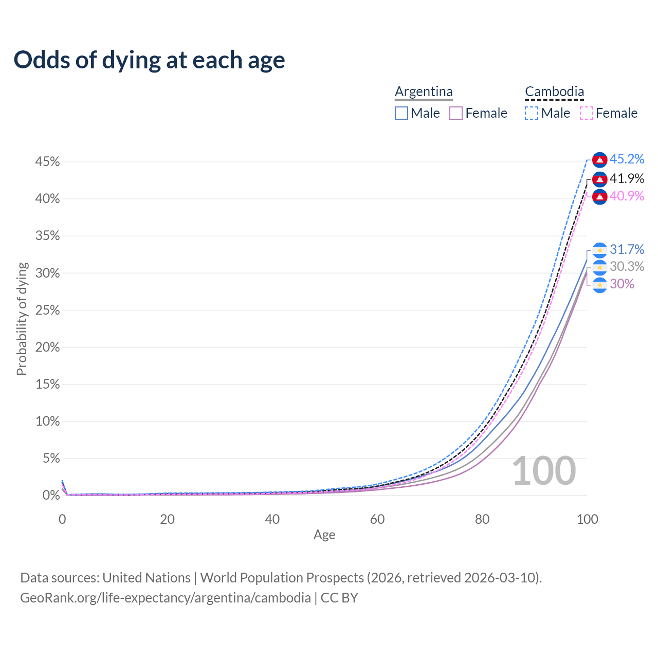 This life expectancy calculator shows the odds of living to 100, 95, 90, and below based on current age for both males and females in Argentina and Cambodia, along with mean and median age of death. The calculations are based on the 2026 life tables (actuarial tables) from the UN World Population Prospects.