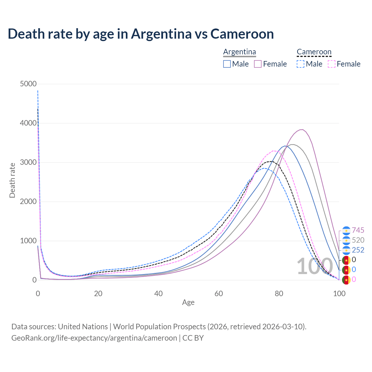 In Argentina, the most common age of death is 85, compared to 0 in Cameroon. The median age of death is 81.4 in Argentina and 71.6 in Cameroon, meaning only half of each cohort is expected to live past that age.