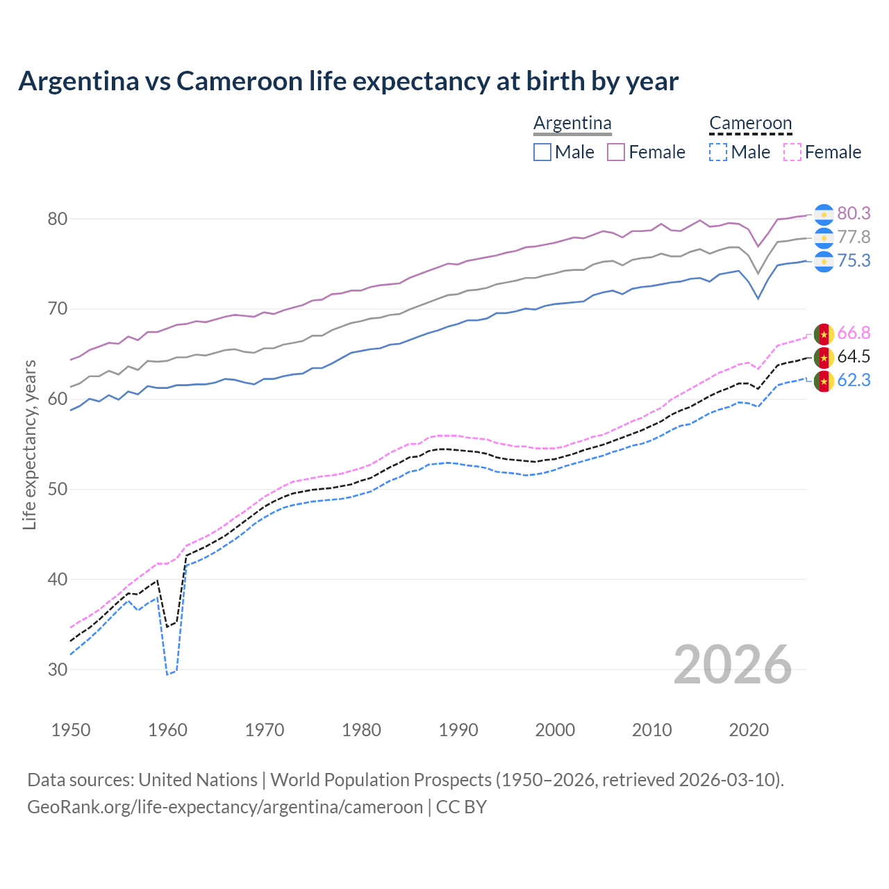 The average life expectancy at birth is 77.8 years in Argentina vs 64.5 in Cameroon. Argentina is ranked 66/197 by life expectancy, and Cameroon is 174/197. In Argentina, the life expectancy is 75.3 years for males and 80.3 years for females. In Cameroon, it's 62.3 years for males and 66.8 years for females.
