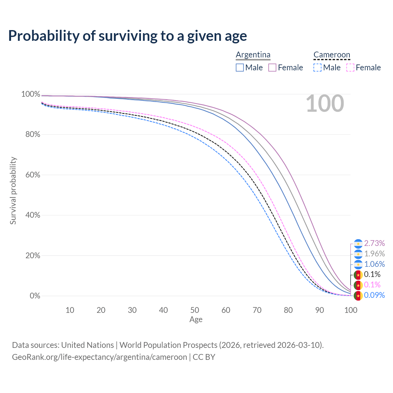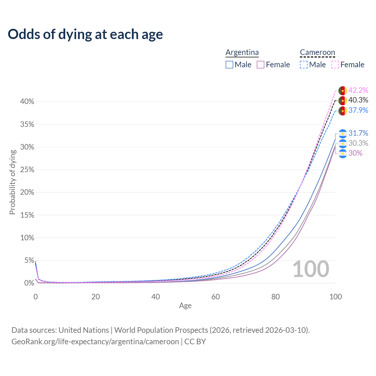 This life expectancy calculator shows the odds of living to 100, 95, 90, and below based on current age for both males and females in Argentina and Cameroon, along with mean and median age of death. The calculations are based on the 2026 life tables (actuarial tables) from the UN World Population Prospects.