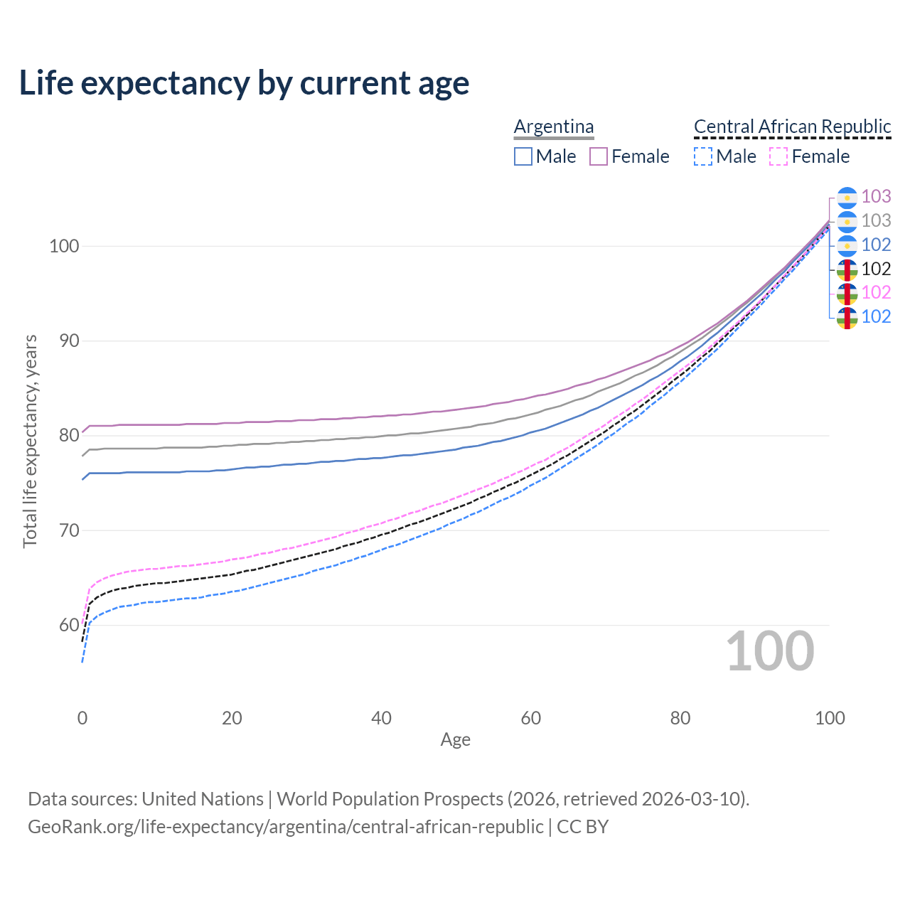 This life expectancy calculator shows the odds of living to 100, 95, 90, and below based on current age for both males and females in Argentina and the Central African Republic, along with mean and median age of death. The calculations are based on the 2026 life tables (actuarial tables) from the UN World Population Prospects.