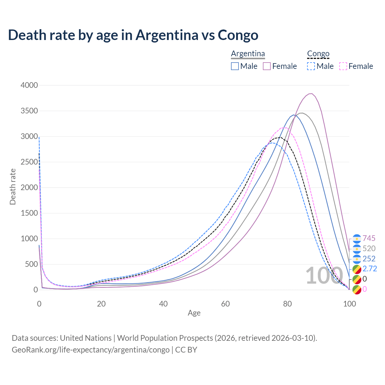 In Argentina, the most common age of death is 85, compared to 78 in the Congo. The median age of death is 81.4 in Argentina and 71.8 in the Congo, meaning only half of each cohort is expected to live past that age.