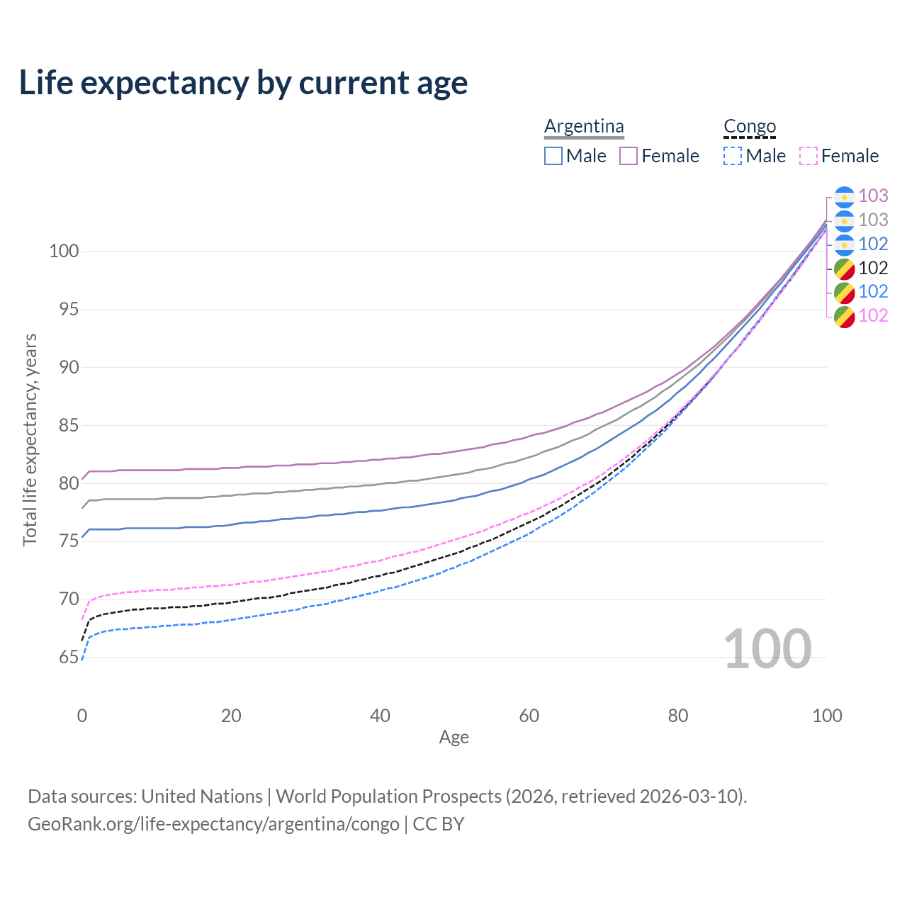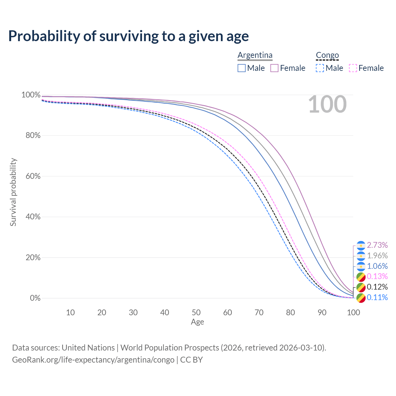 This life expectancy calculator shows the odds of living to 100, 95, 90, and below based on current age for both males and females in Argentina and the Congo, along with mean and median age of death. The calculations are based on the 2026 life tables (actuarial tables) from the UN World Population Prospects.