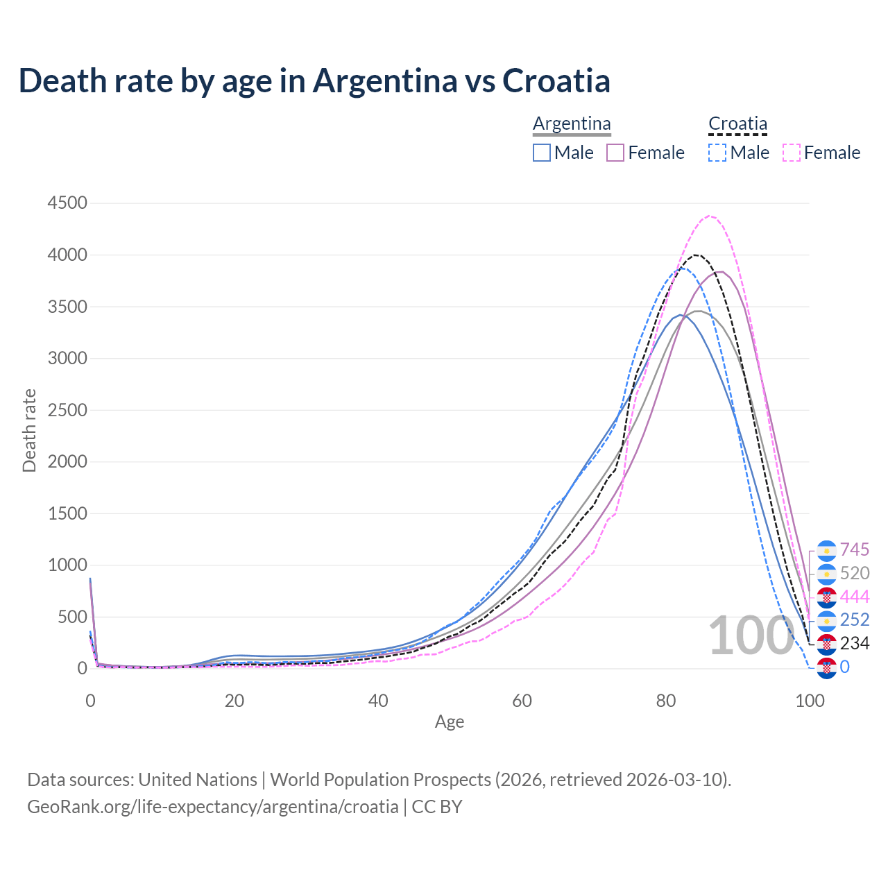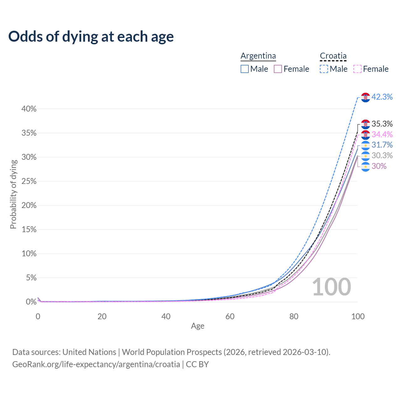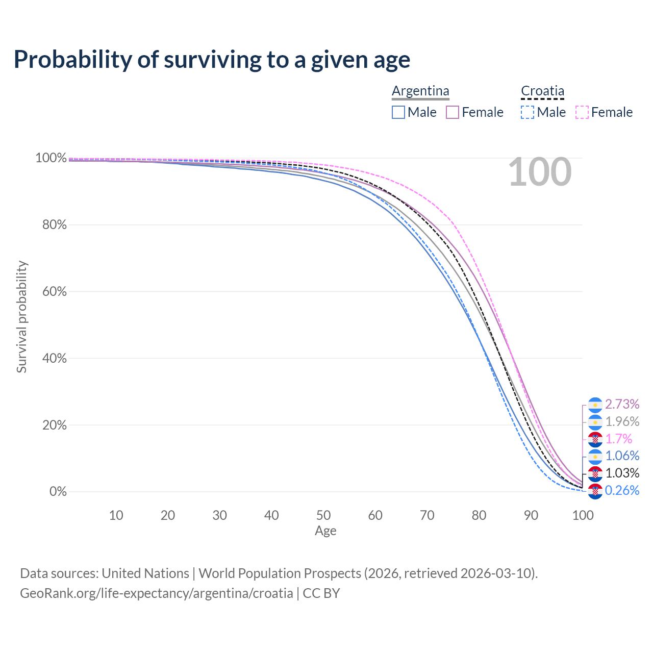 This life expectancy calculator shows the odds of living to 100, 95, 90, and below based on current age for both males and females in Argentina and Croatia, along with mean and median age of death. The calculations are based on the 2026 life tables (actuarial tables) from the UN World Population Prospects.