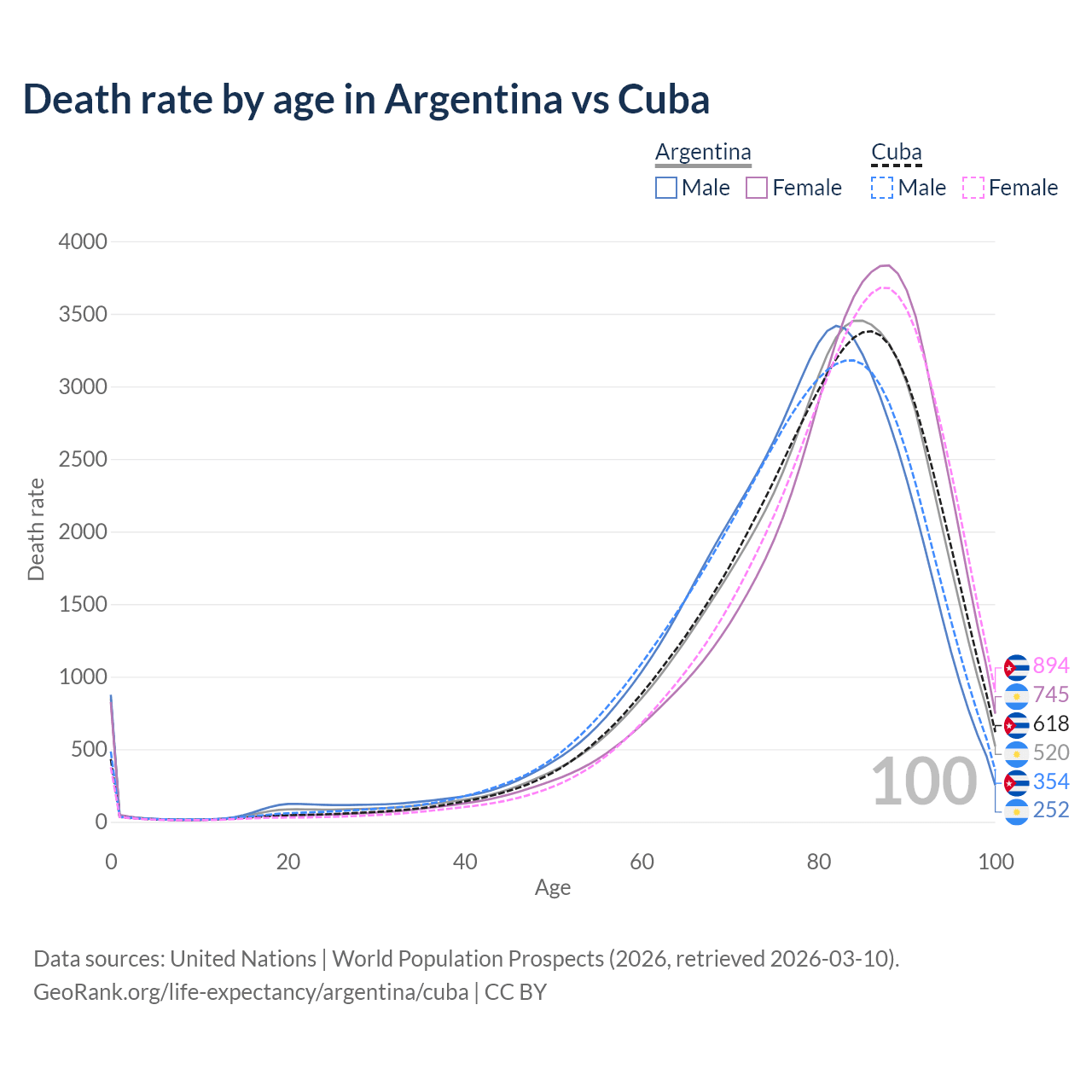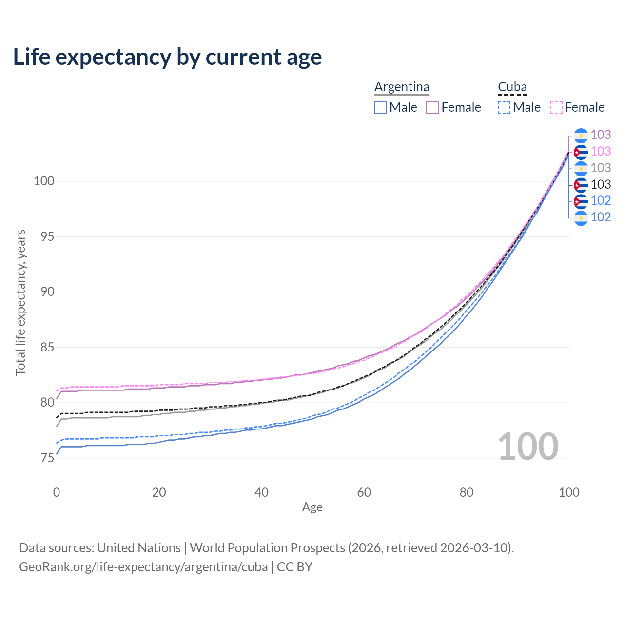 This life expectancy calculator shows the odds of living to 100, 95, 90, and below based on current age for both males and females in Argentina and Cuba, along with mean and median age of death. The calculations are based on the 2026 life tables (actuarial tables) from the UN World Population Prospects.