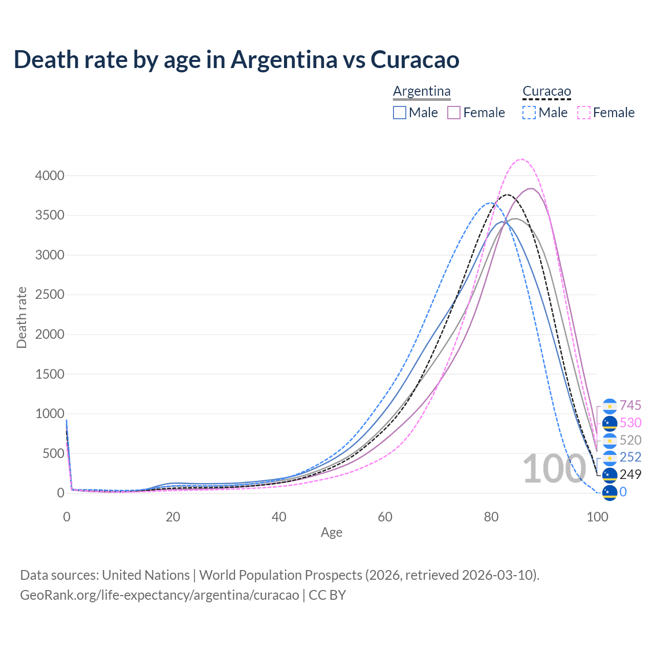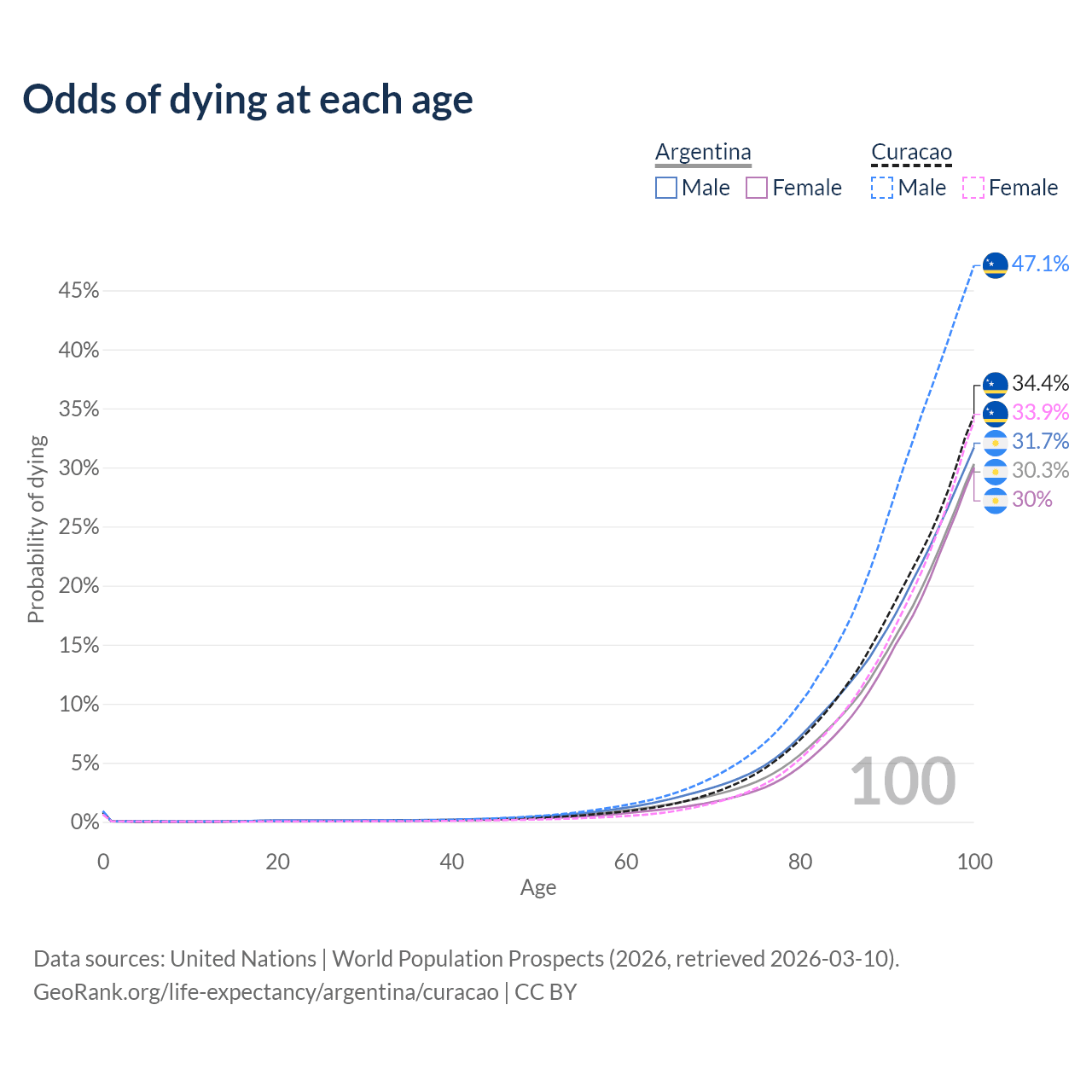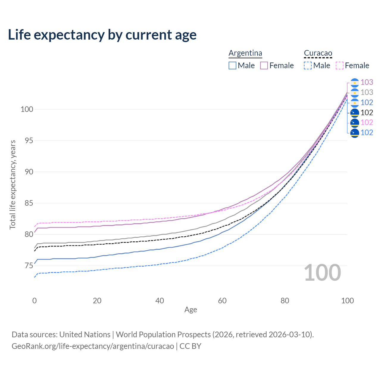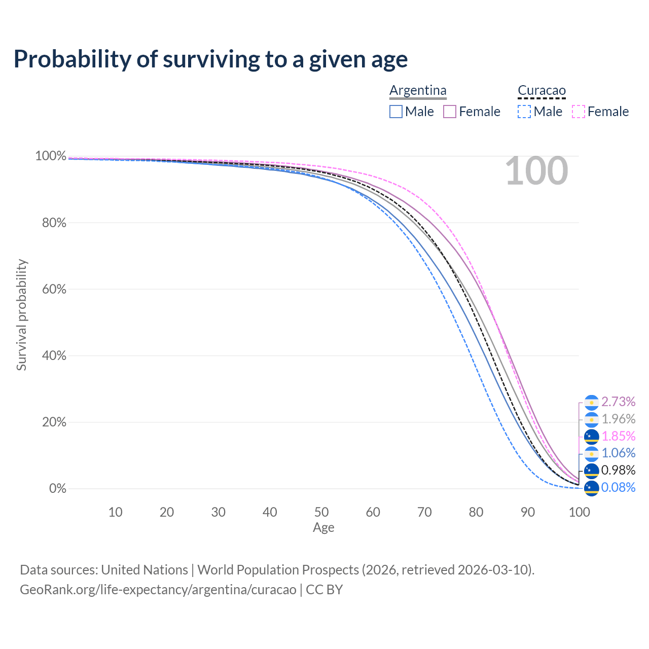 This life expectancy calculator shows the odds of living to 100, 95, 90, and below based on current age for both males and females in Argentina and Curacao, along with mean and median age of death. The calculations are based on the 2026 life tables (actuarial tables) from the UN World Population Prospects.