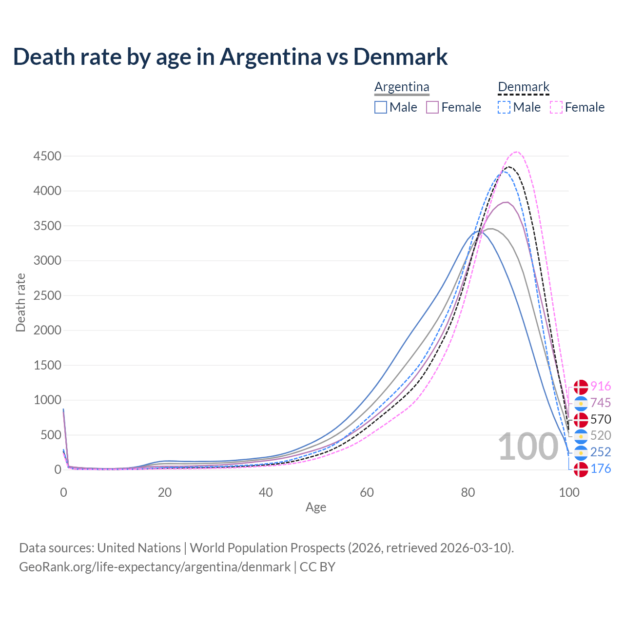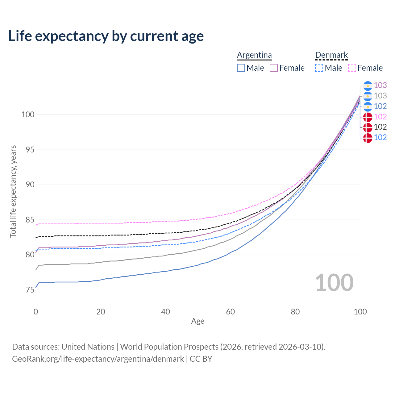 This life expectancy calculator shows the odds of living to 100, 95, 90, and below based on current age for both males and females in Argentina and Denmark, along with mean and median age of death. The calculations are based on the 2026 life tables (actuarial tables) from the UN World Population Prospects.