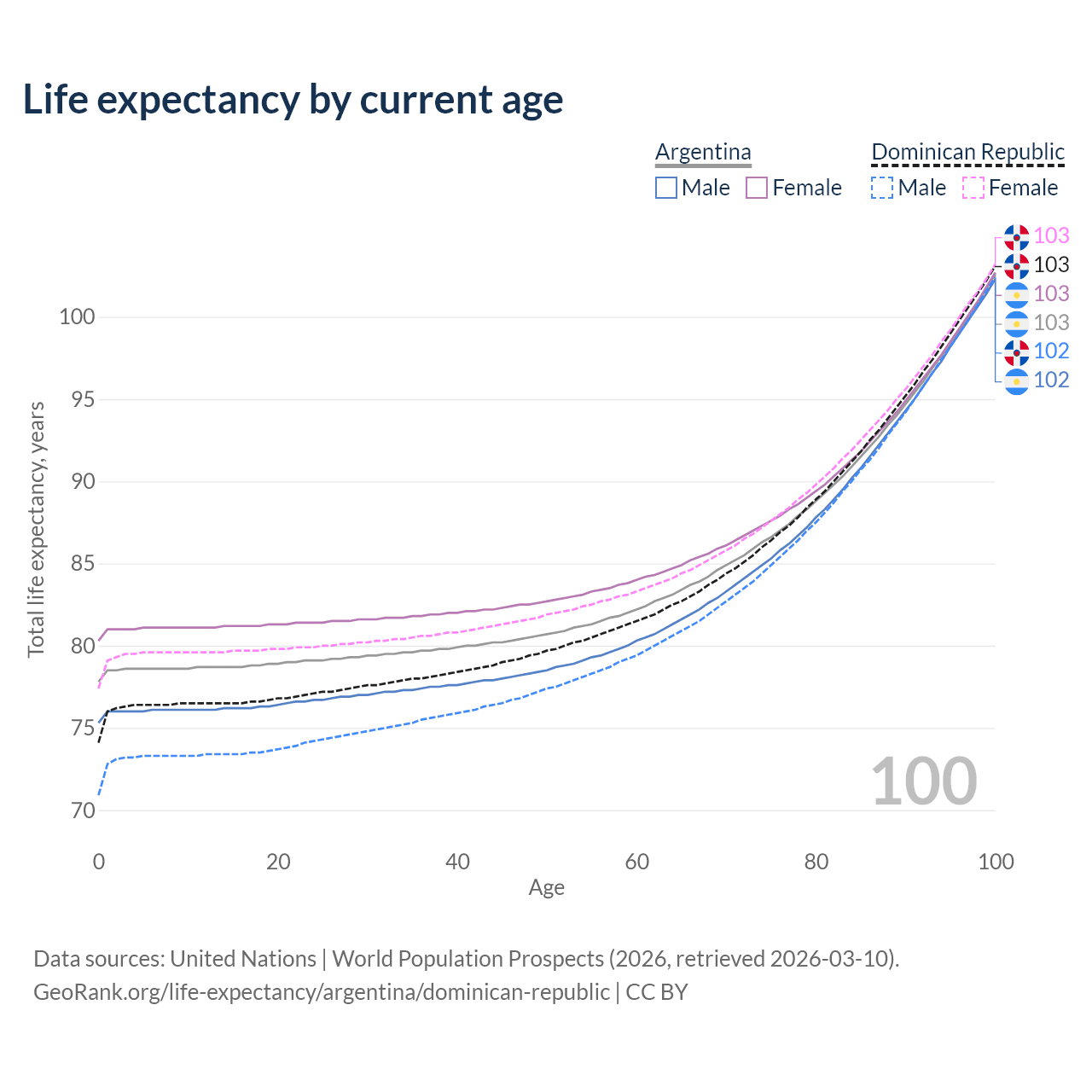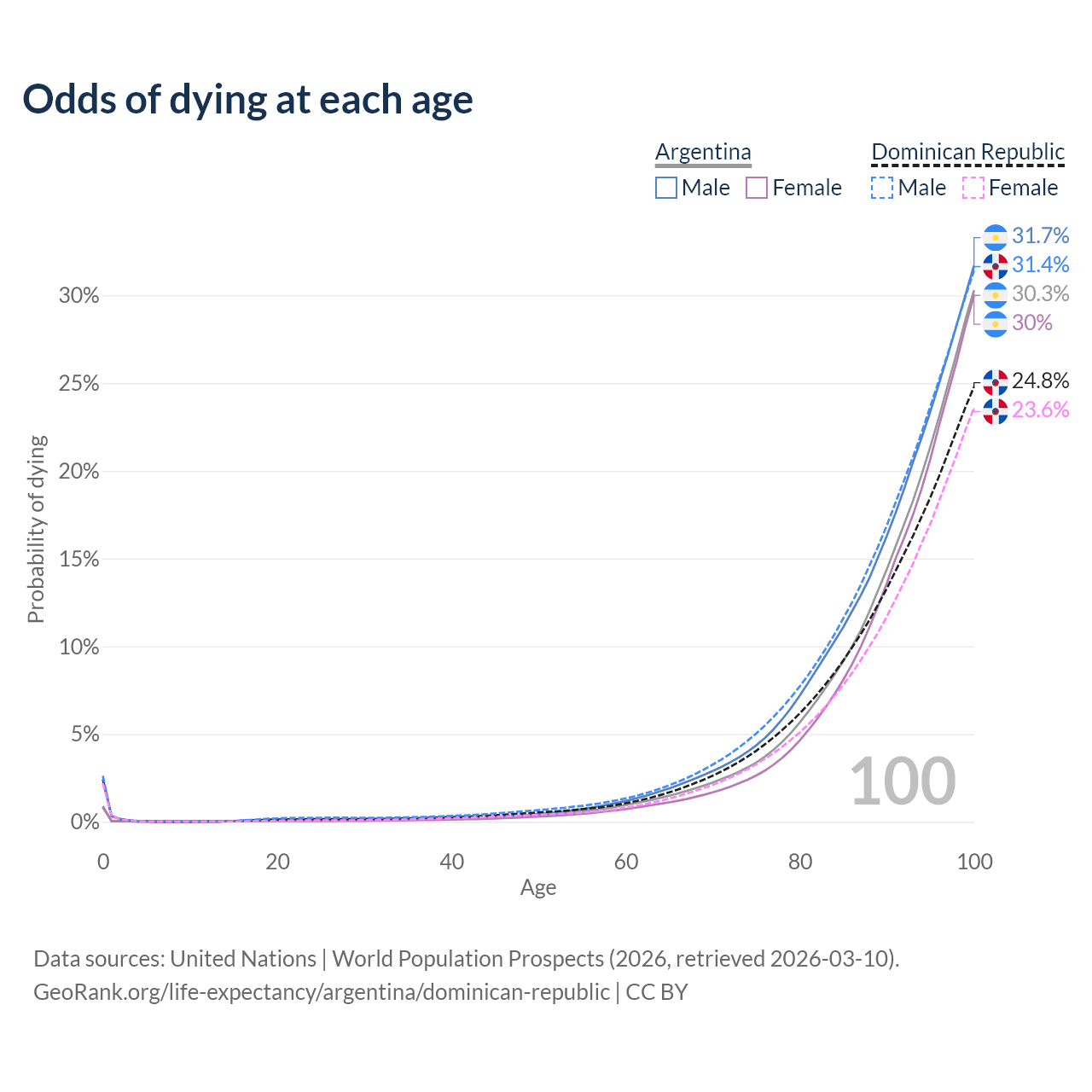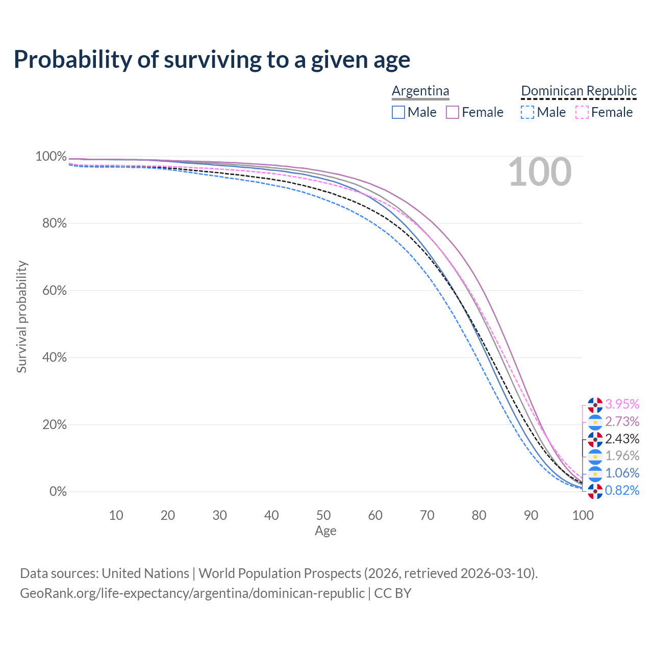 This life expectancy calculator shows the odds of living to 100, 95, 90, and below based on current age for both males and females in Argentina and the Dominican Republic, along with mean and median age of death. The calculations are based on the 2026 life tables (actuarial tables) from the UN World Population Prospects.