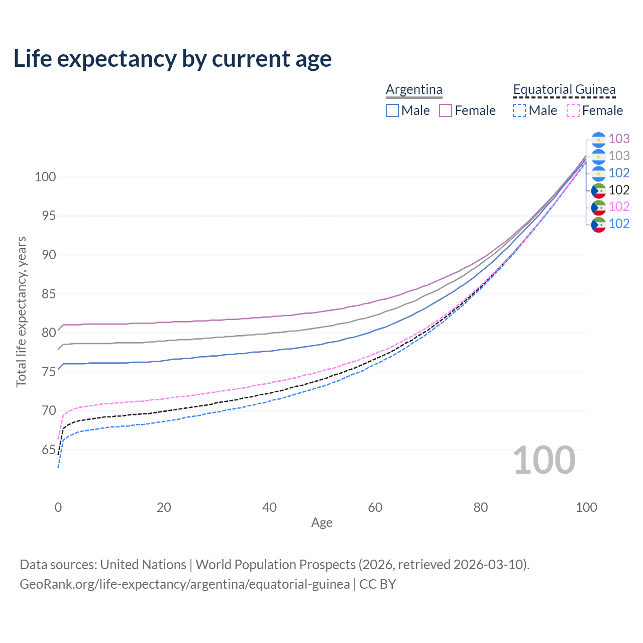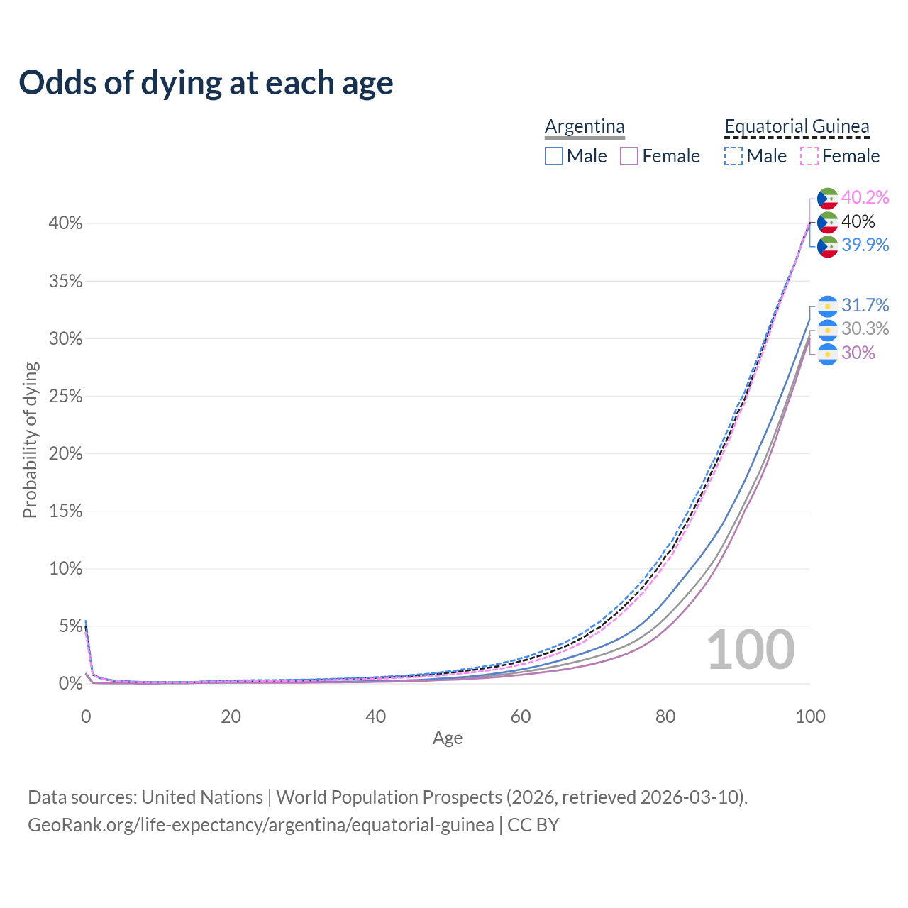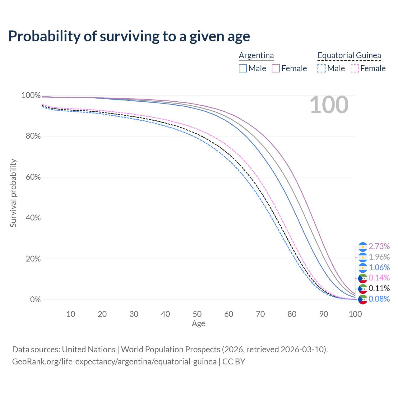 This life expectancy calculator shows the odds of living to 100, 95, 90, and below based on current age for both males and females in Argentina and Equatorial Guinea, along with mean and median age of death. The calculations are based on the 2026 life tables (actuarial tables) from the UN World Population Prospects.