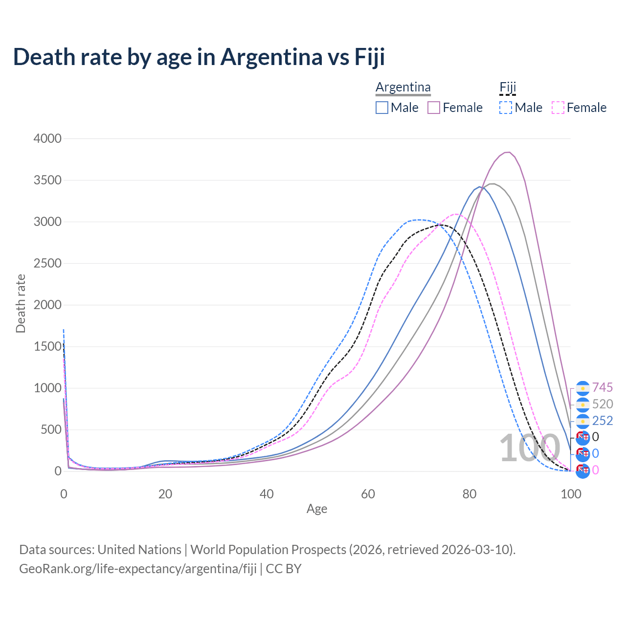 In Argentina, the most common age of death is 85, compared to 74 in Fiji. The median age of death is 81.4 in Argentina and 70.5 in Fiji, meaning only half of each cohort is expected to live past that age.