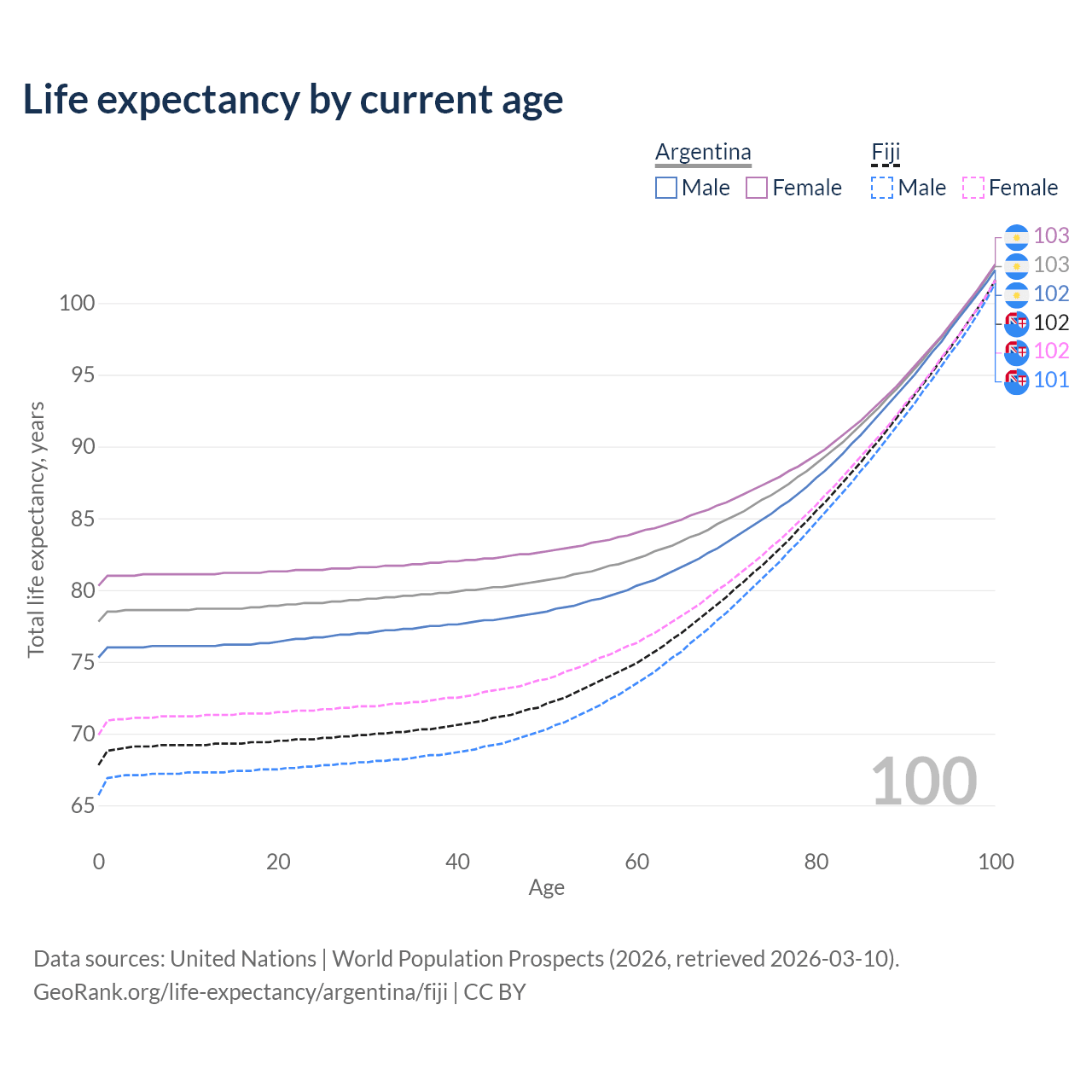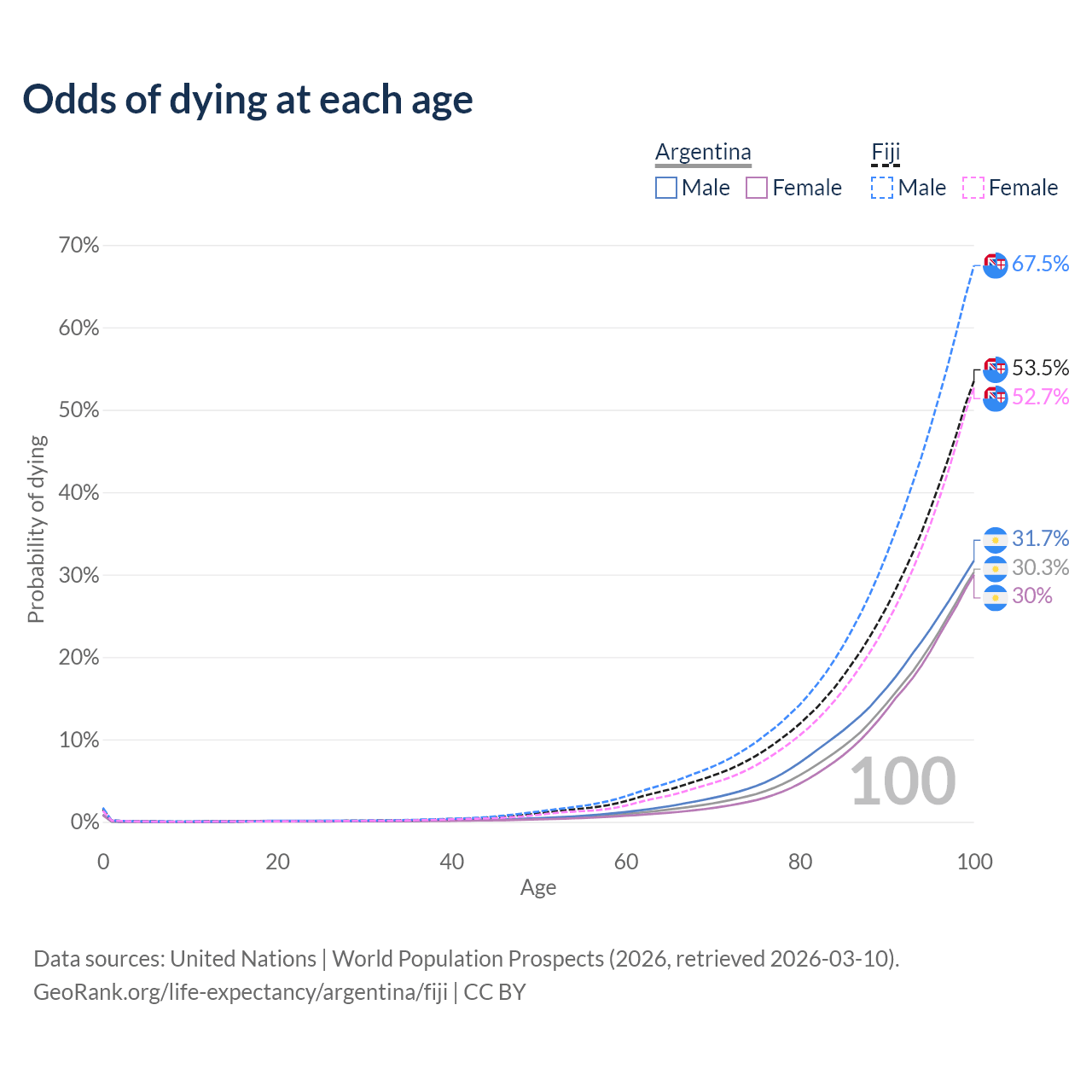 This life expectancy calculator shows the odds of living to 100, 95, 90, and below based on current age for both males and females in Argentina and Fiji, along with mean and median age of death. The calculations are based on the 2026 life tables (actuarial tables) from the UN World Population Prospects.