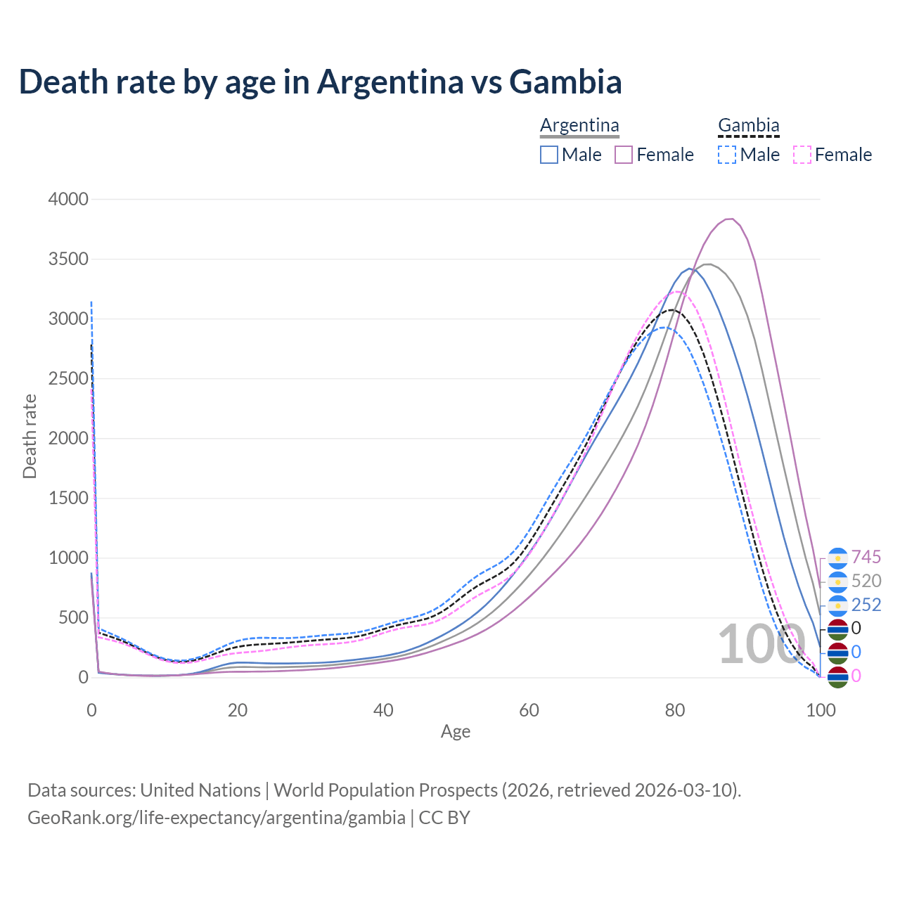 In Argentina, the most common age of death is 85, compared to 80 in the Gambia. The median age of death is 81.4 in Argentina and 73.4 in the Gambia, meaning only half of each cohort is expected to live past that age.