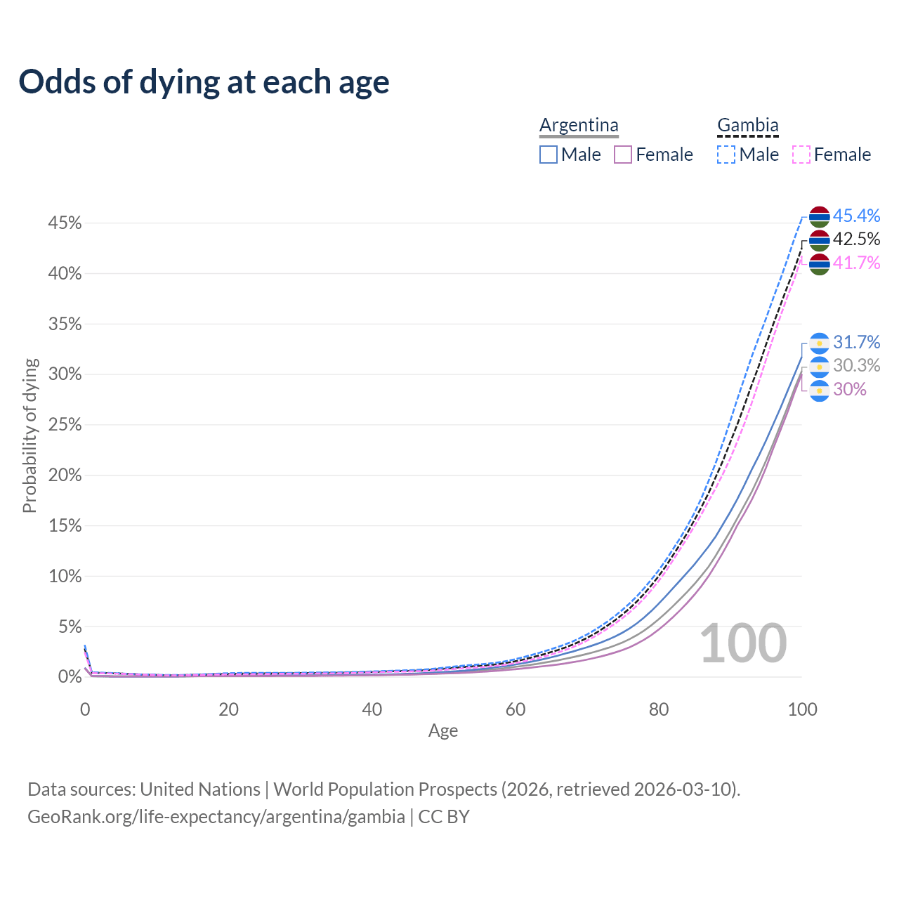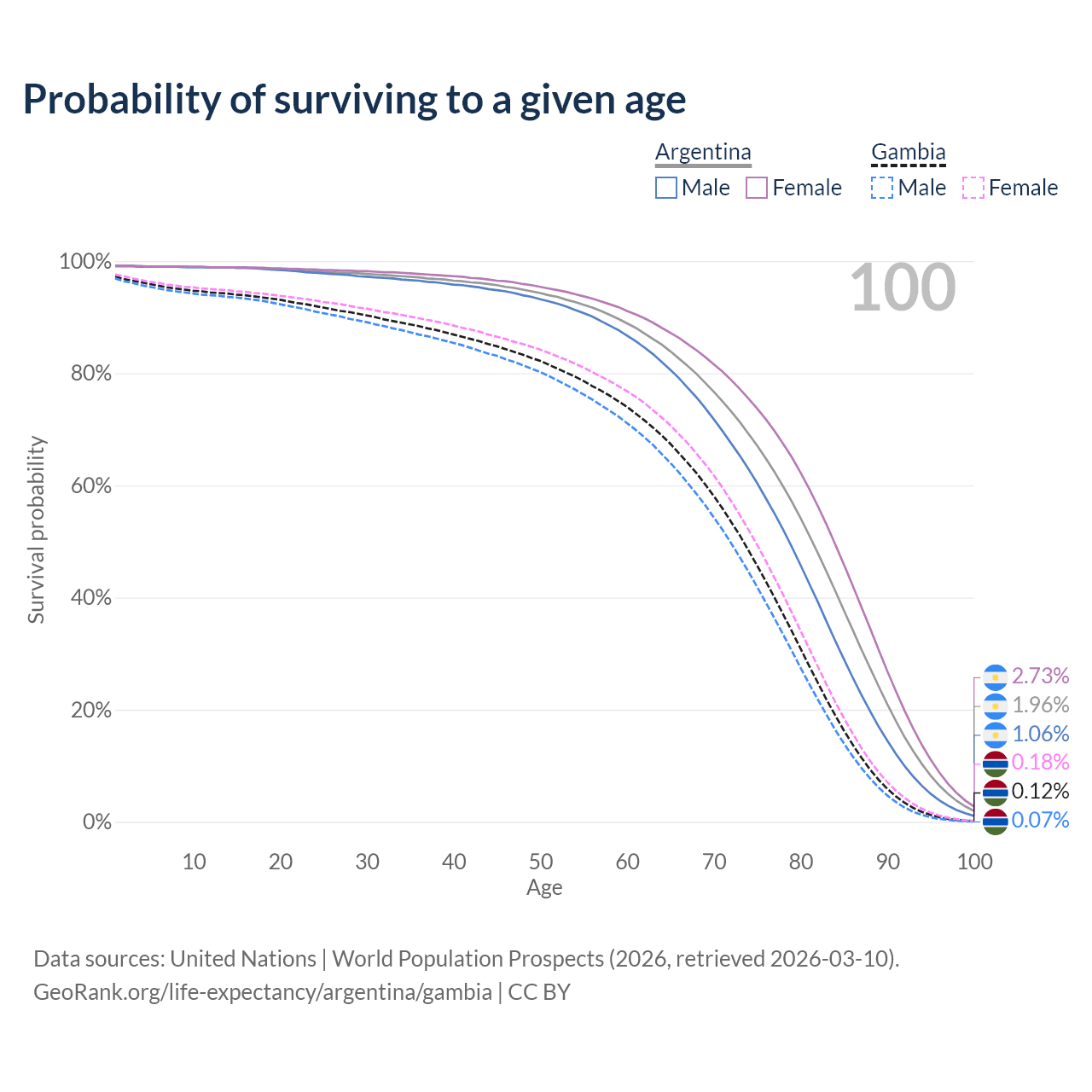 This life expectancy calculator shows the odds of living to 100, 95, 90, and below based on current age for both males and females in Argentina and the Gambia, along with mean and median age of death. The calculations are based on the 2026 life tables (actuarial tables) from the UN World Population Prospects.