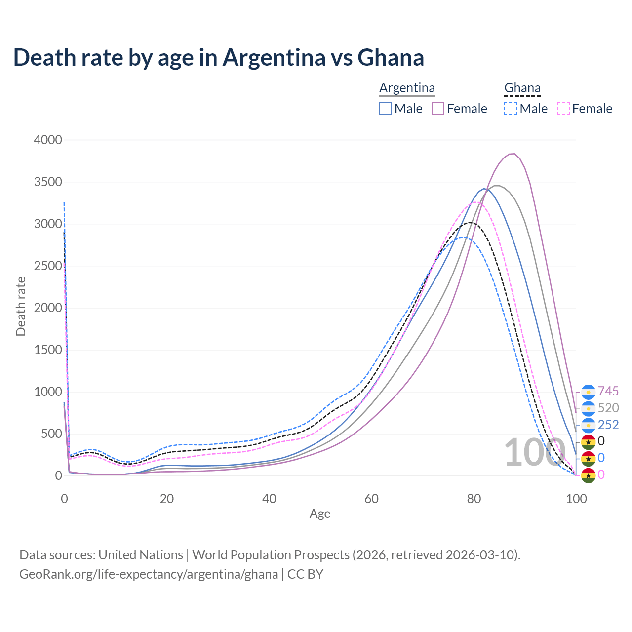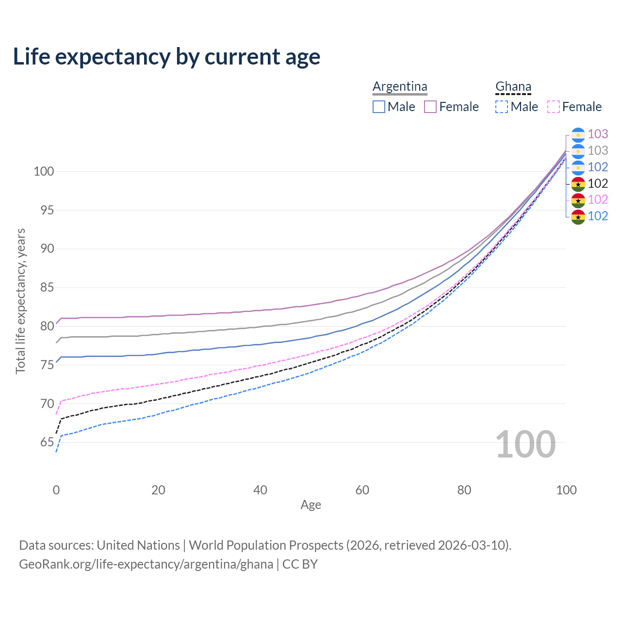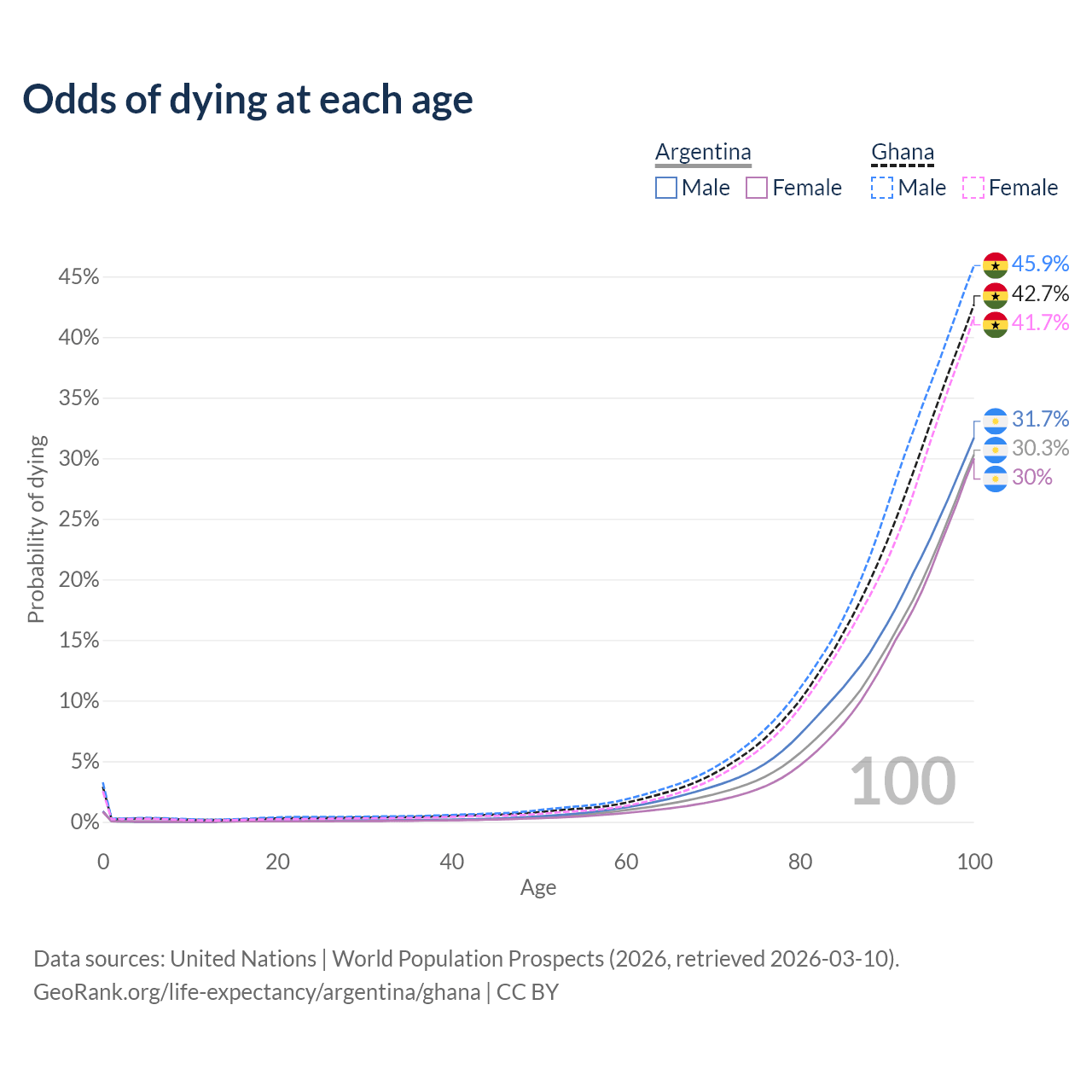 This life expectancy calculator shows the odds of living to 100, 95, 90, and below based on current age for both males and females in Argentina and Ghana, along with mean and median age of death. The calculations are based on the 2026 life tables (actuarial tables) from the UN World Population Prospects.