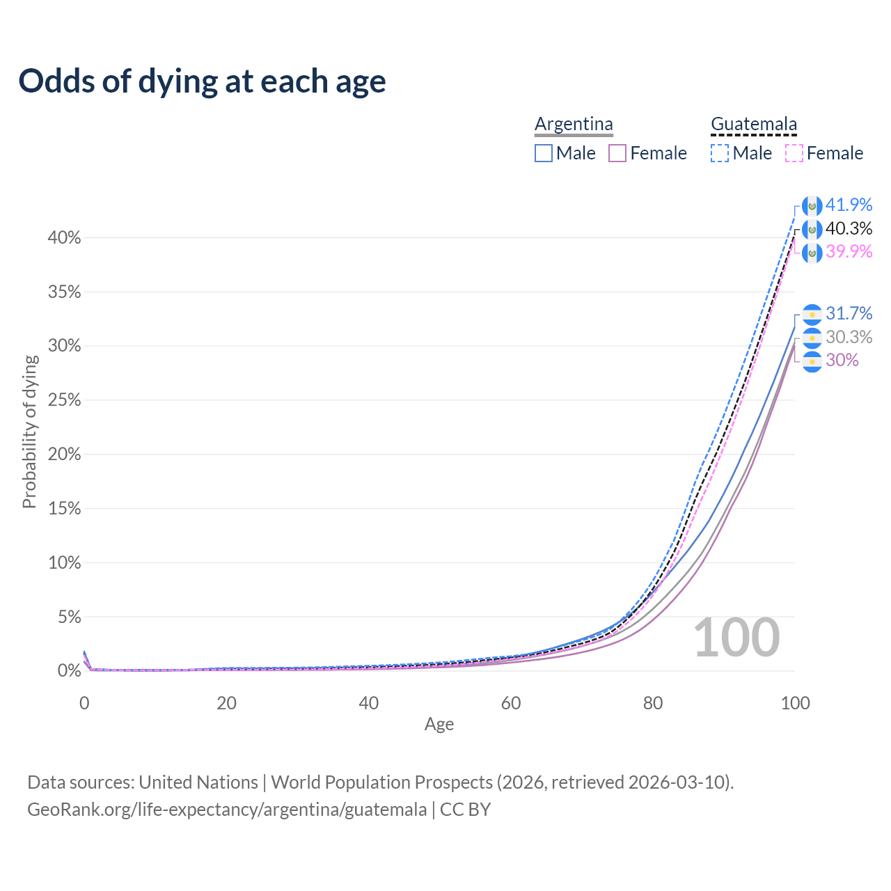 This life expectancy calculator shows the odds of living to 100, 95, 90, and below based on current age for both males and females in Argentina and Guatemala, along with mean and median age of death. The calculations are based on the 2026 life tables (actuarial tables) from the UN World Population Prospects.