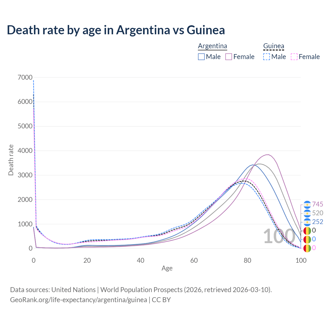 In Argentina, the most common age of death is 85, compared to 0 in Guinea. The median age of death is 81.4 in Argentina and 70.6 in Guinea, meaning only half of each cohort is expected to live past that age.