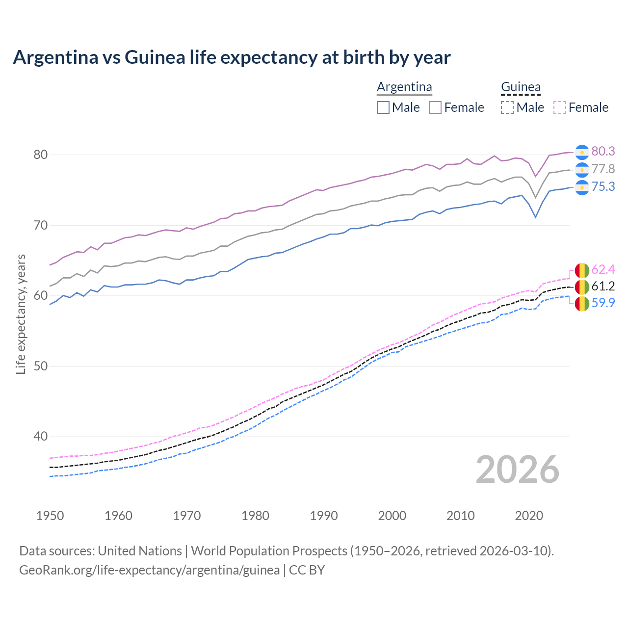 The average life expectancy at birth is 77.8 years in Argentina vs 61.2 in Guinea. Argentina is ranked 66/197 by life expectancy, and Guinea is 190/197. In Argentina, the life expectancy is 75.3 years for males and 80.3 years for females. In Guinea, it's 59.9 years for males and 62.4 years for females.