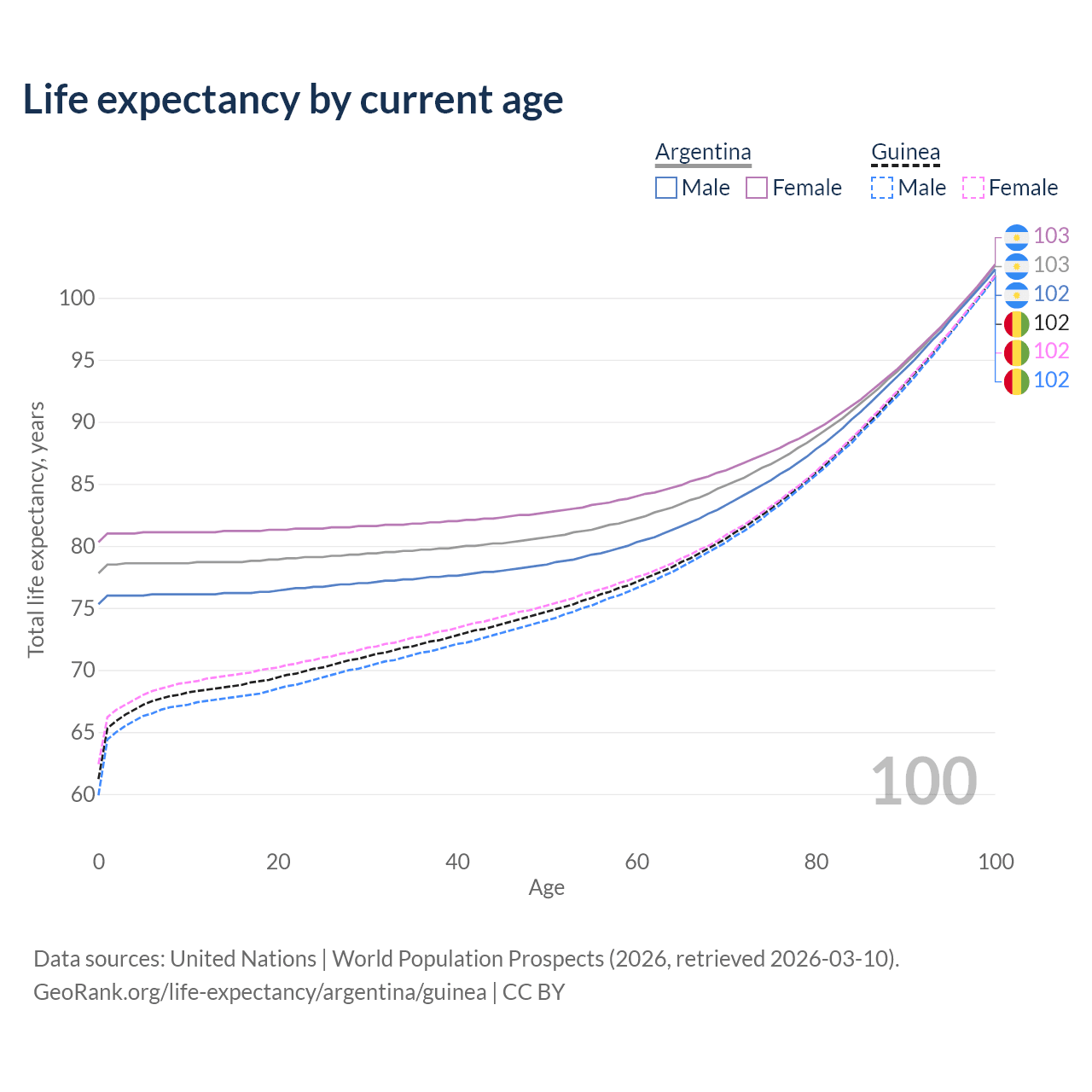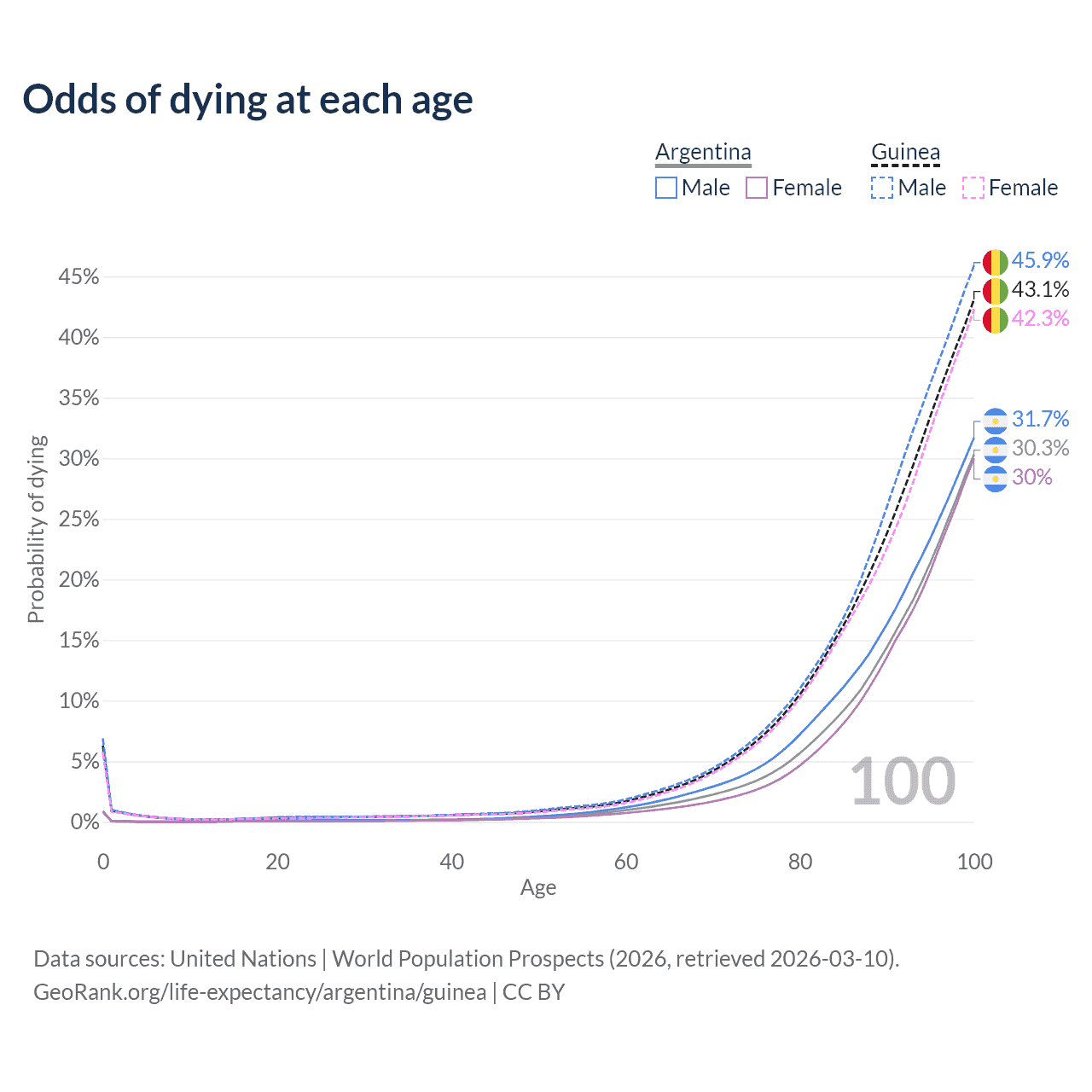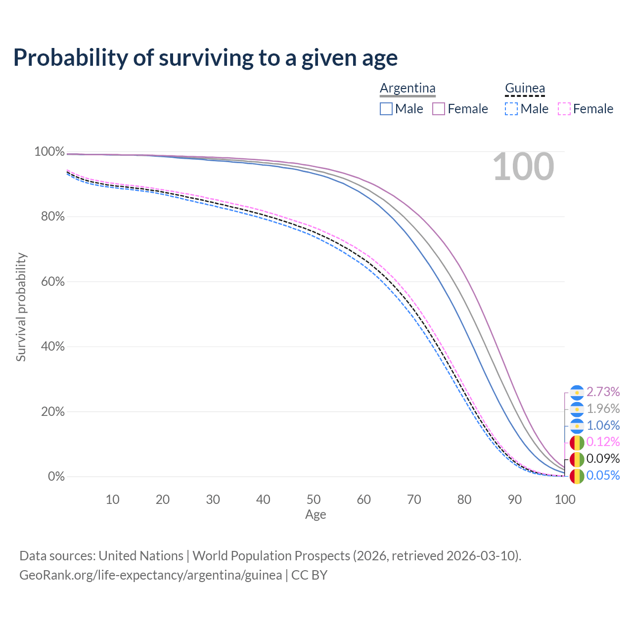 This life expectancy calculator shows the odds of living to 100, 95, 90, and below based on current age for both males and females in Argentina and Guinea, along with mean and median age of death. The calculations are based on the 2026 life tables (actuarial tables) from the UN World Population Prospects.