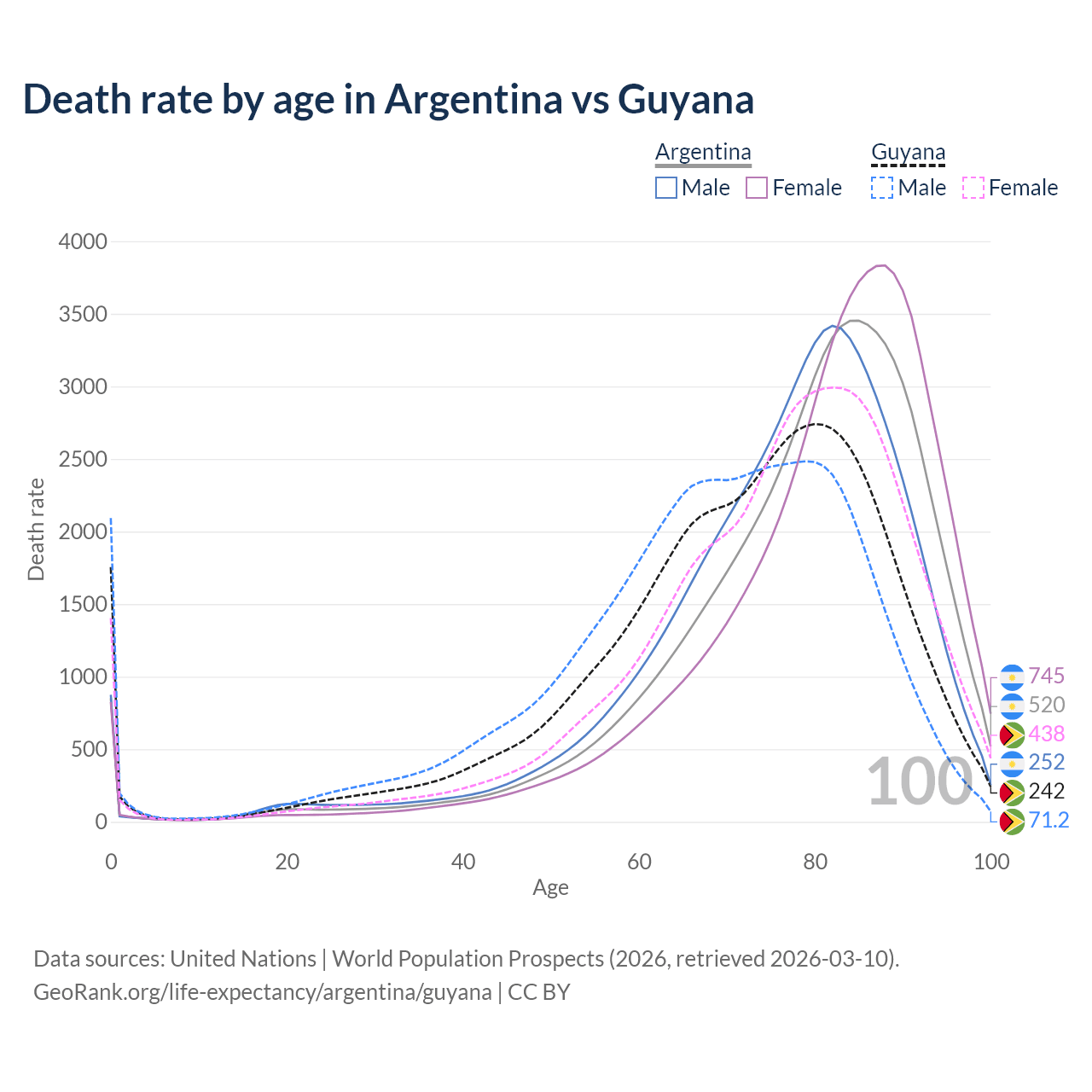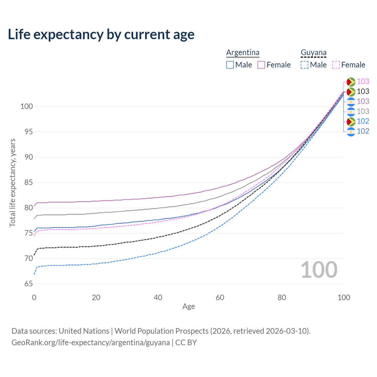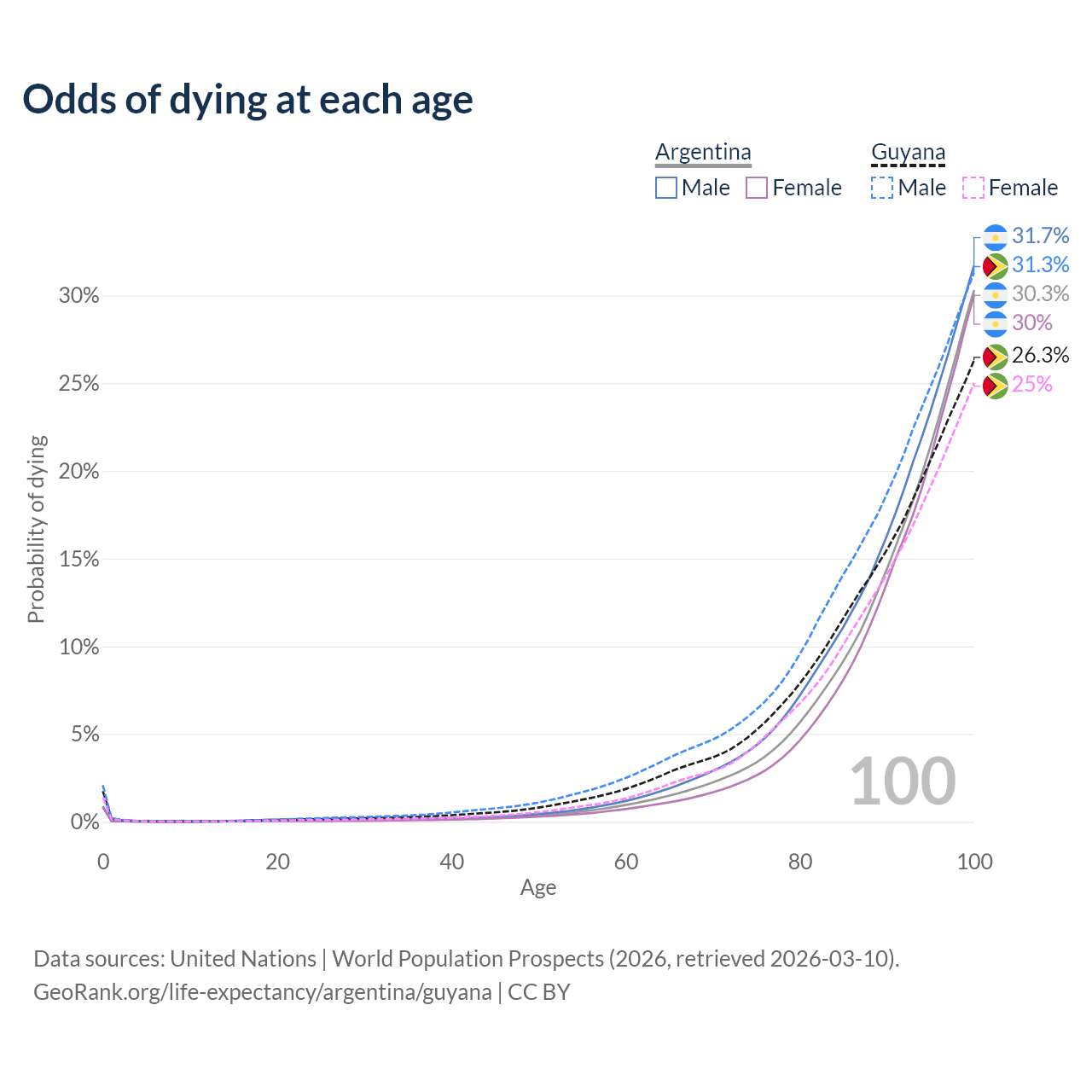 This life expectancy calculator shows the odds of living to 100, 95, 90, and below based on current age for both males and females in Argentina and Guyana, along with mean and median age of death. The calculations are based on the 2026 life tables (actuarial tables) from the UN World Population Prospects.