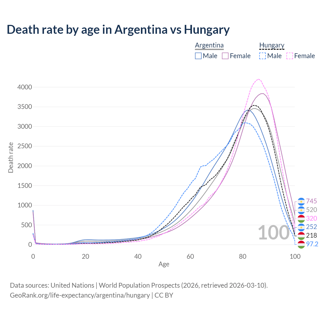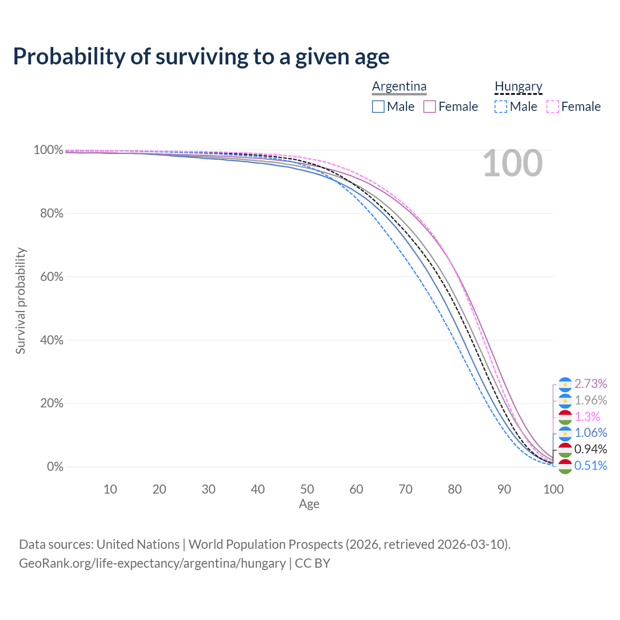 This life expectancy calculator shows the odds of living to 100, 95, 90, and below based on current age for both males and females in Argentina and Hungary, along with mean and median age of death. The calculations are based on the 2026 life tables (actuarial tables) from the UN World Population Prospects.