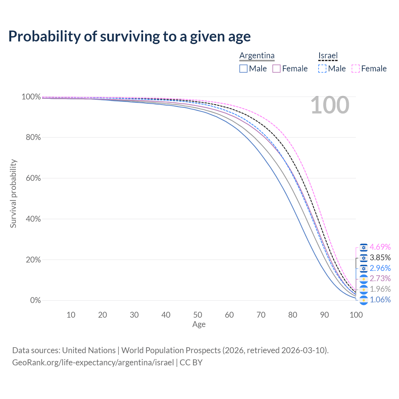 This life expectancy calculator shows the odds of living to 100, 95, 90, and below based on current age for both males and females in Argentina and Israel, along with mean and median age of death. The calculations are based on the 2026 life tables (actuarial tables) from the UN World Population Prospects.
