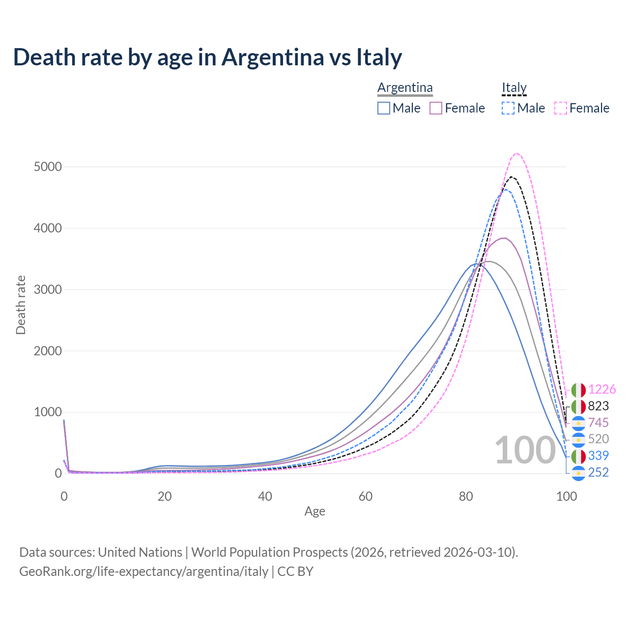 In Argentina, the most common age of death is 85, compared to 89 in Italy. The median age of death is 81.4 in Argentina and 86.9 in Italy, meaning only half of each cohort is expected to live past that age.