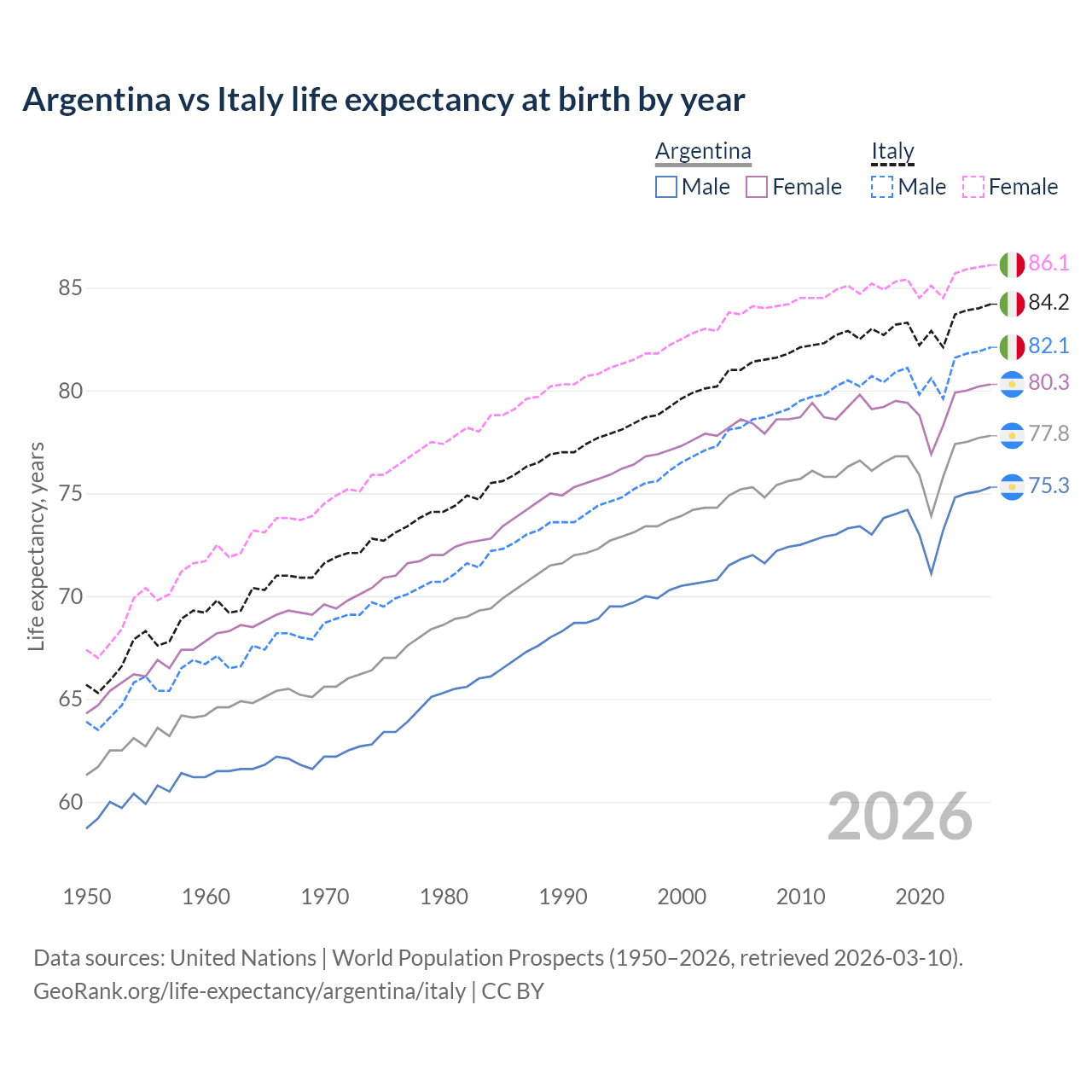 The average life expectancy at birth is 77.8 years in Argentina vs 84.2 in Italy. Argentina is ranked 66/197 by life expectancy, and Italy is 8/197. In Argentina, the life expectancy is 75.3 years for males and 80.3 years for females. In Italy, it's 82.1 years for males and 86.1 years for females.