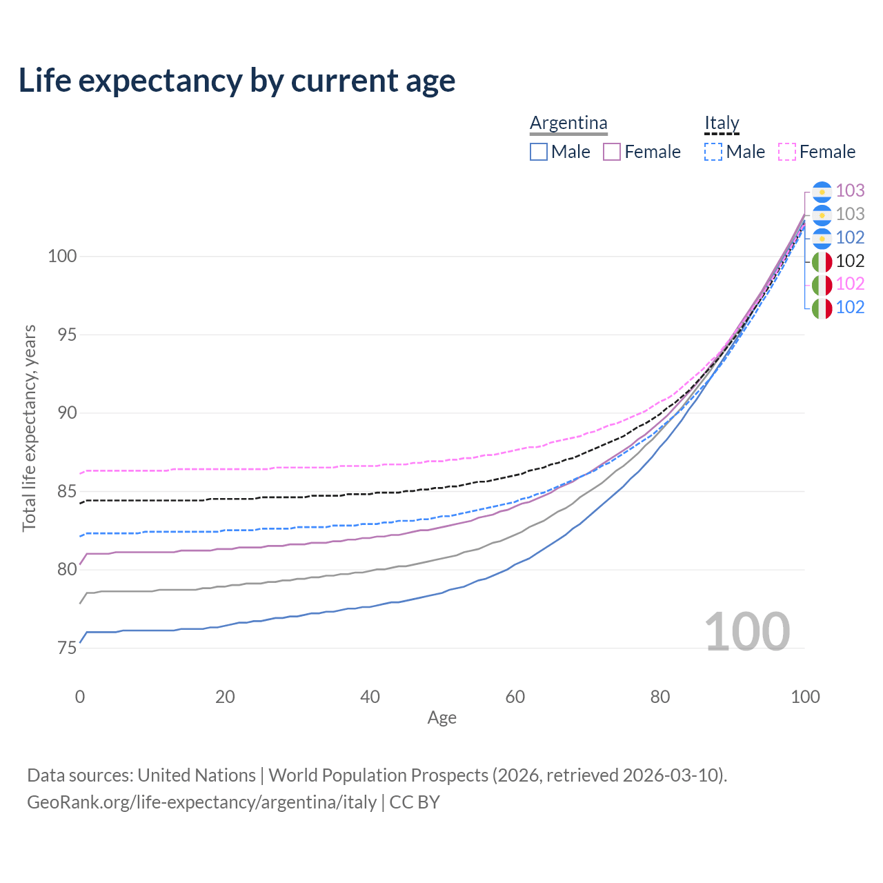 This life expectancy calculator shows the odds of living to 100, 95, 90, and below based on current age for both males and females in Argentina and Italy, along with mean and median age of death. The calculations are based on the 2026 life tables (actuarial tables) from the UN World Population Prospects.