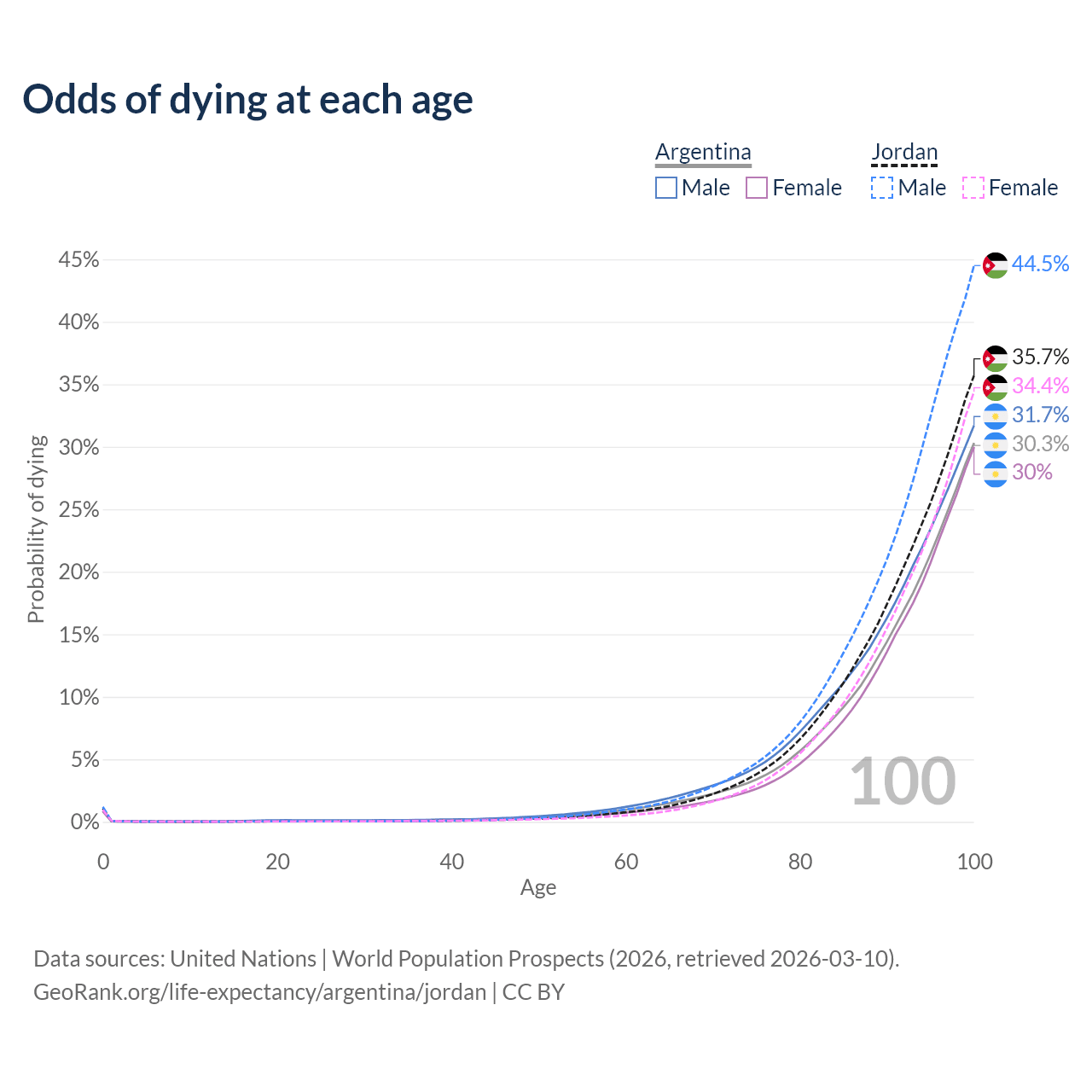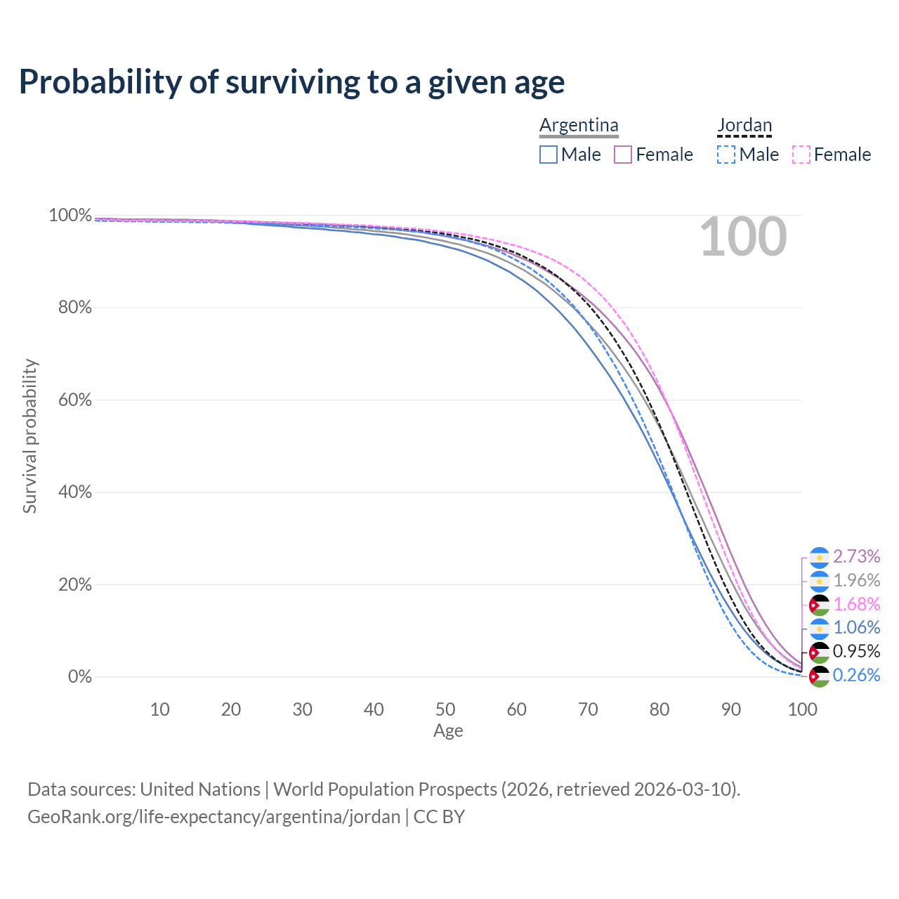 This life expectancy calculator shows the odds of living to 100, 95, 90, and below based on current age for both males and females in Argentina and Jordan, along with mean and median age of death. The calculations are based on the 2026 life tables (actuarial tables) from the UN World Population Prospects.