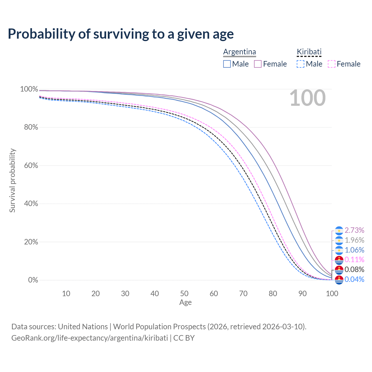 This life expectancy calculator shows the odds of living to 100, 95, 90, and below based on current age for both males and females in Argentina and Kiribati, along with mean and median age of death. The calculations are based on the 2026 life tables (actuarial tables) from the UN World Population Prospects.