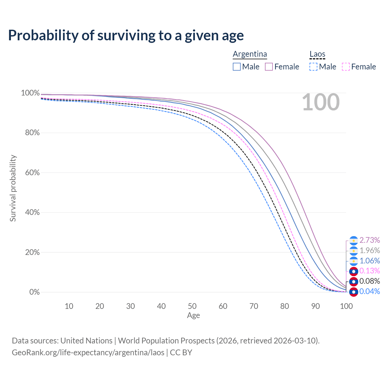 This life expectancy calculator shows the odds of living to 100, 95, 90, and below based on current age for both males and females in Argentina and Laos, along with mean and median age of death. The calculations are based on the 2026 life tables (actuarial tables) from the UN World Population Prospects.