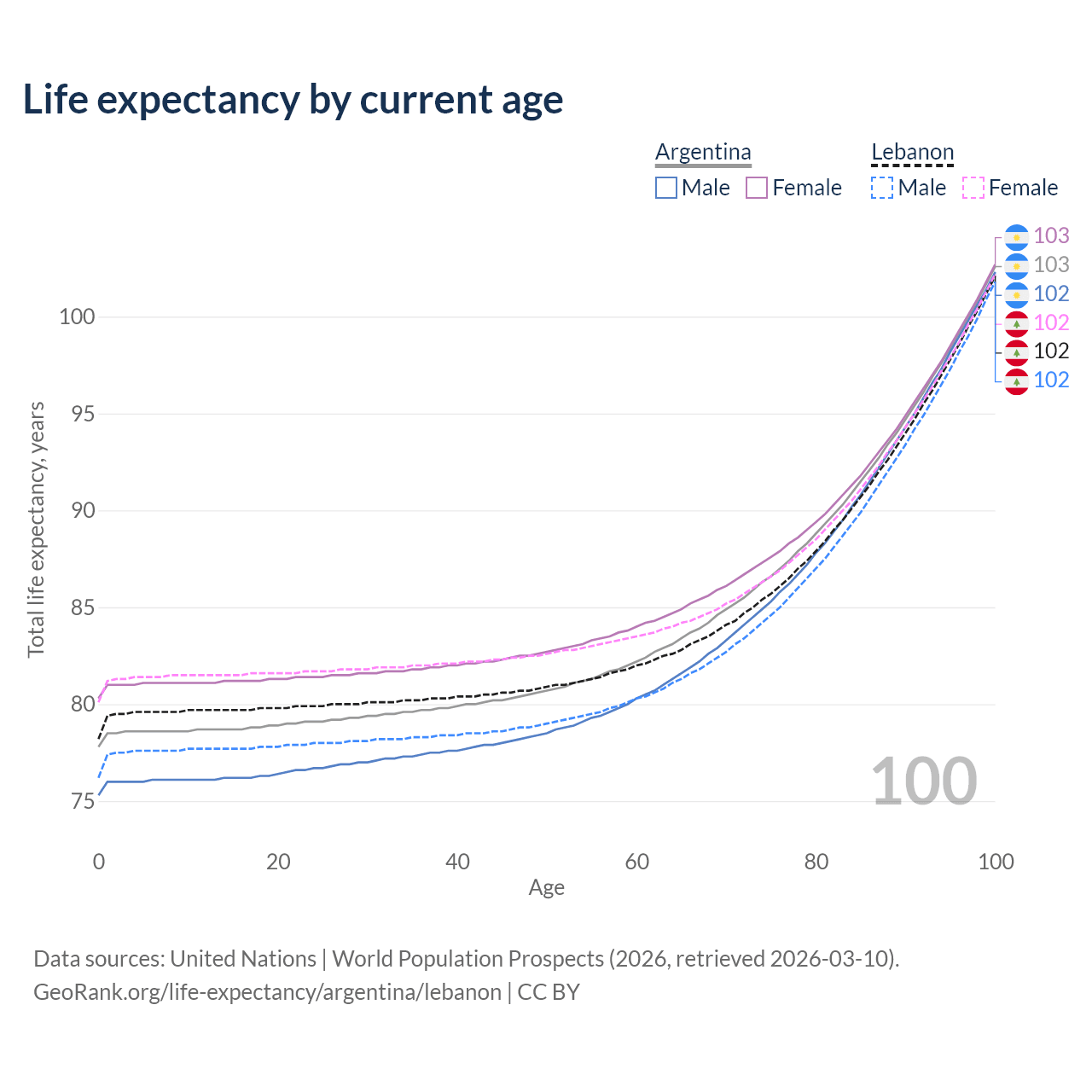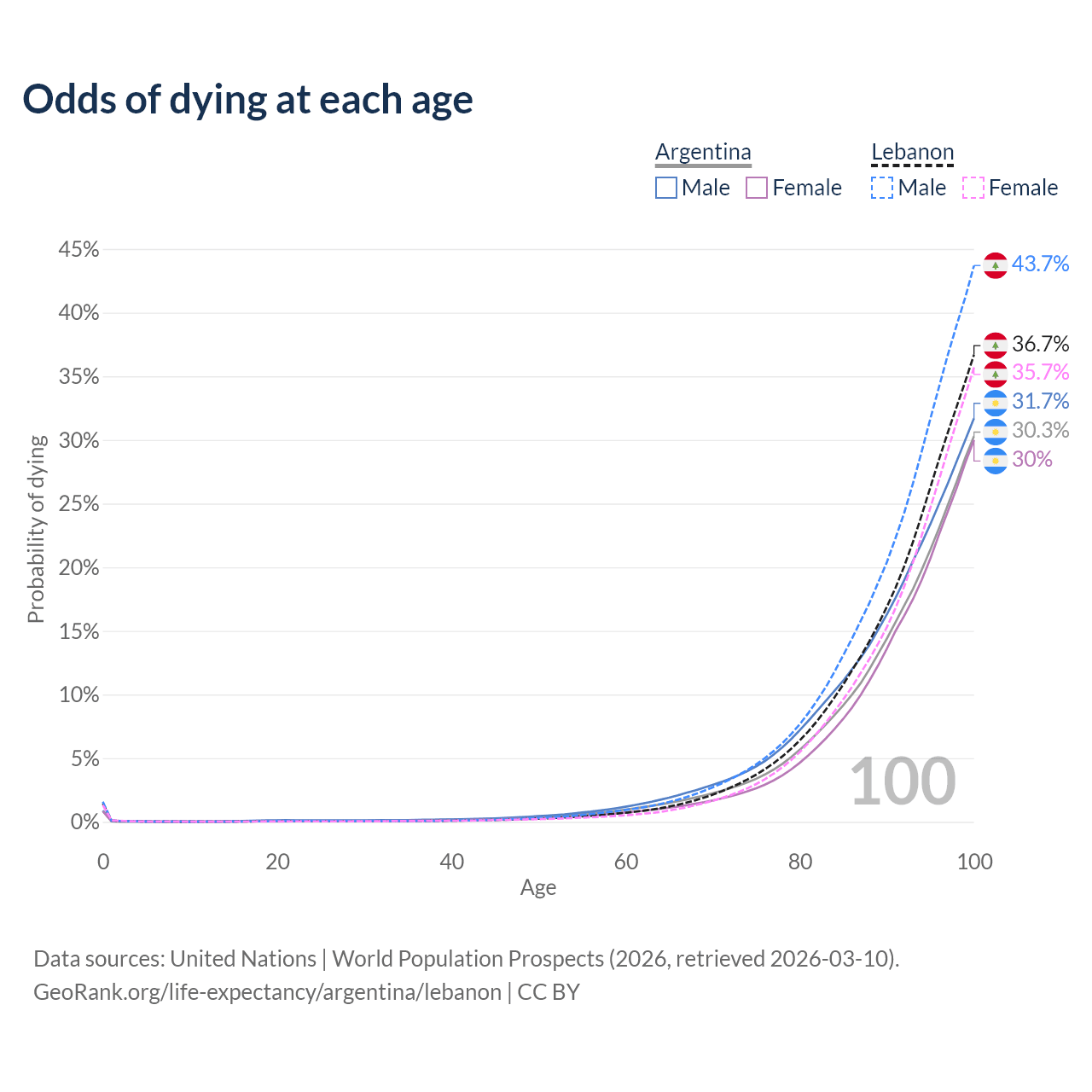 This life expectancy calculator shows the odds of living to 100, 95, 90, and below based on current age for both males and females in Argentina and Lebanon, along with mean and median age of death. The calculations are based on the 2026 life tables (actuarial tables) from the UN World Population Prospects.